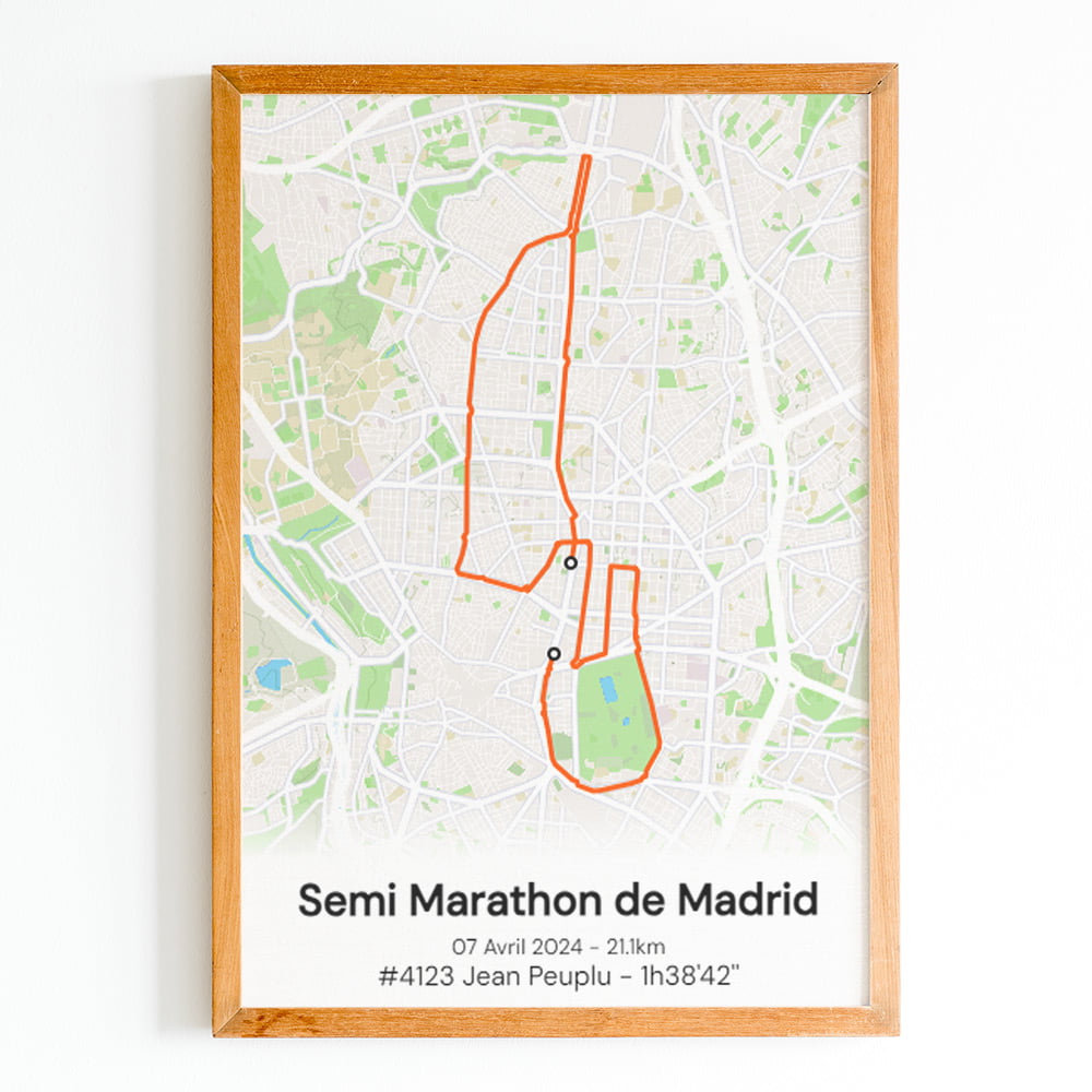 Cette affiche du parcours du Semi Marathon de Madrid est imprimée sur du papier photo brillant haute qualité.Pour créer un poster personnel et unique, ajoutez votre numéro de dossard, votre nom, prénom, votre temps d'arrivée ou le texte que vous souhaitez.