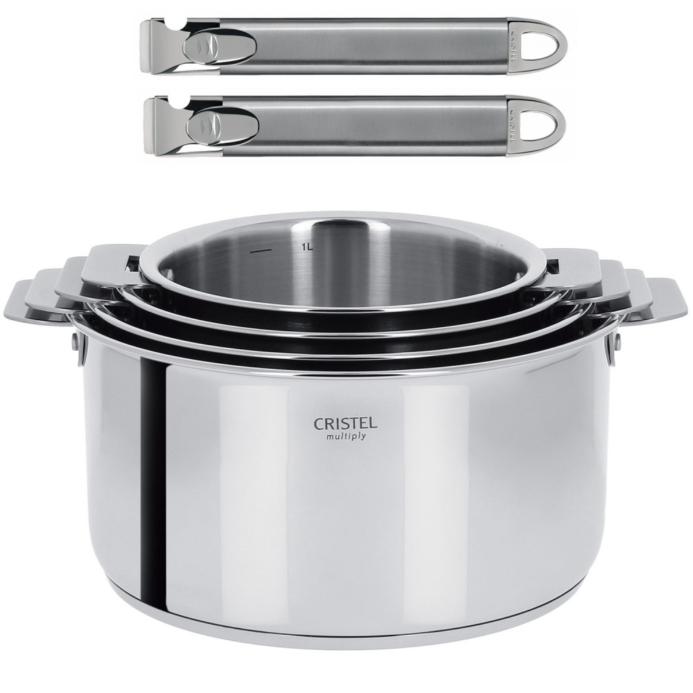 Batterie de 4 casseroles issues de la collection Casteline amovible et fabriquées en France par Cristel. Ces casseroles sont en taille 14, 16, 18 & 20cm, elles sont en acier inoxydable avec finition brillante. Elles sont compatibles tous feux dont induction et four.