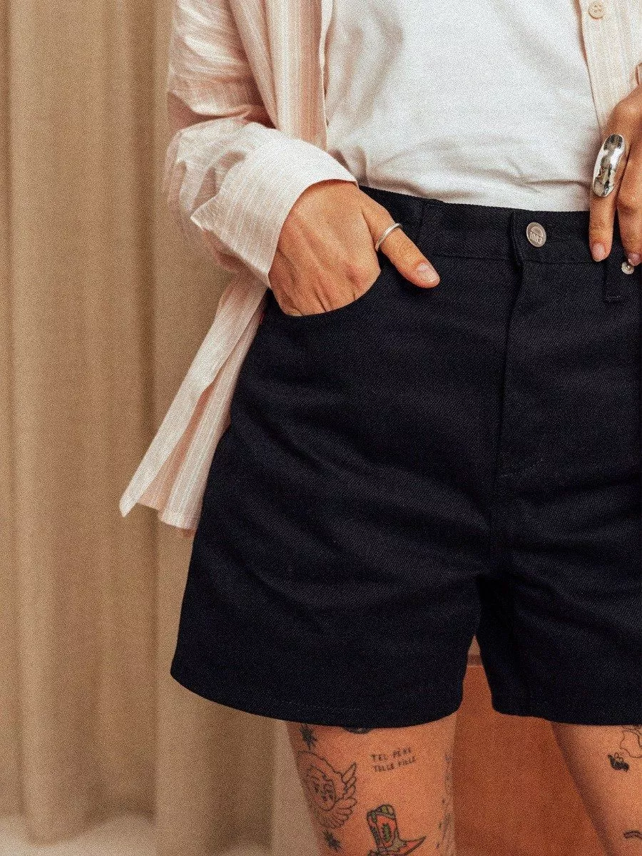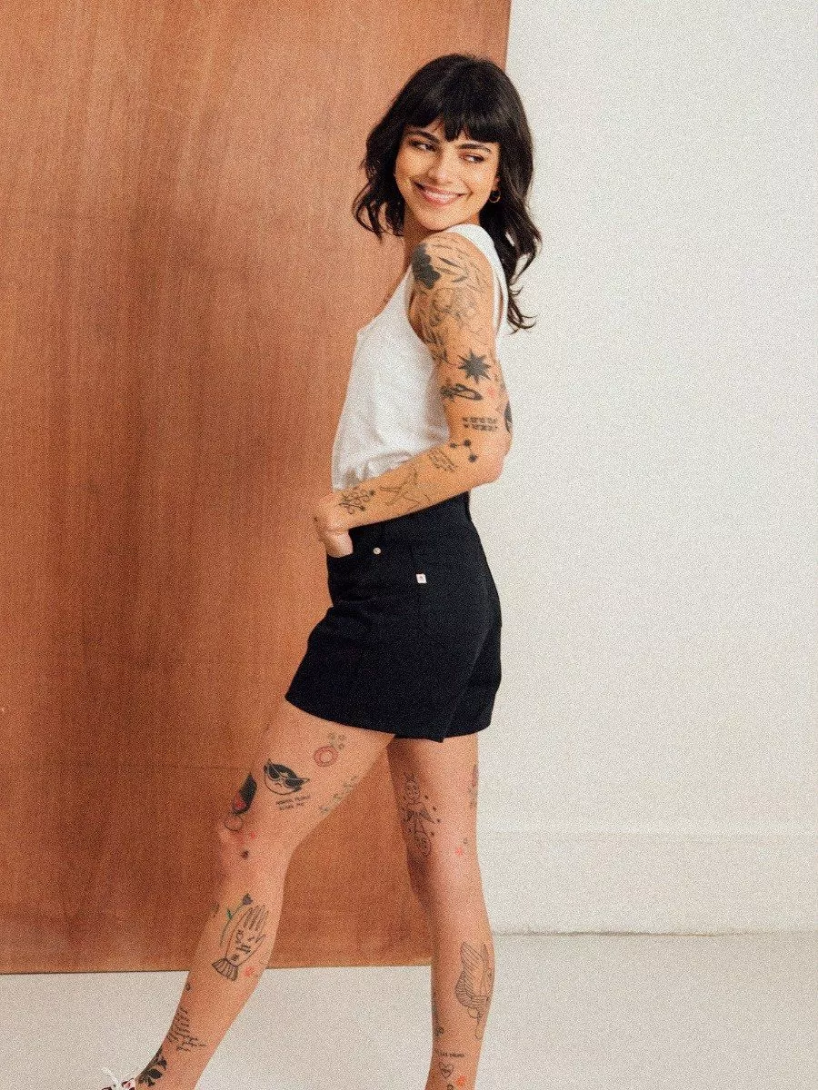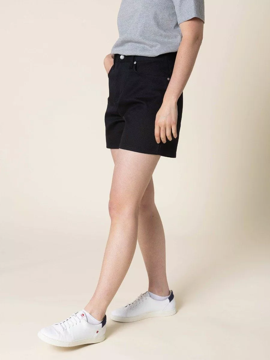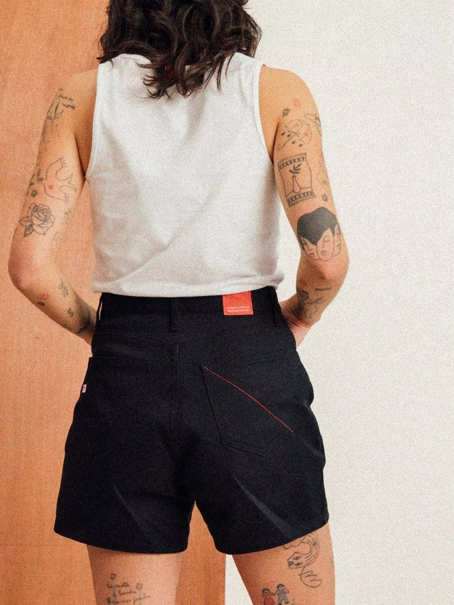 LE SHORT EN JEANS NOIR FEMME Ne cherchez plus le short qui vous accompagnera tout l'été ! Notre short en jeans noir femme taille haute 276H a tout pour lui : une taille haute, une coupe large et un denim ultra-confortable. Son petit truc en plus ? Une poche ticket qui vous permet de ranger de petits objets.