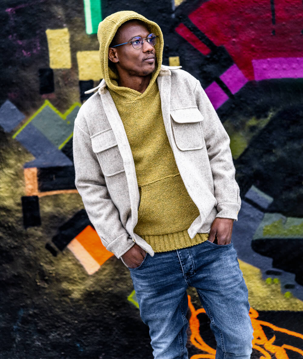 100% laine vierge locale. Sergé recyclé, coupe droite, manches basses, col de chemise, poches de poitrine plaquées à rabat, boutons bois. Longueur: 75cm.