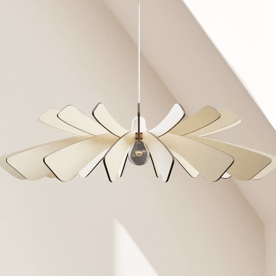 Un luminaire inspiré par la nature – Suspension élégante fabriquée en bois de bouleau – Design unique qui diffuse une lumière douce et chaleureuse. – Fabriqué à la main en France, en collaboration avec l’Atelier Loupiote.