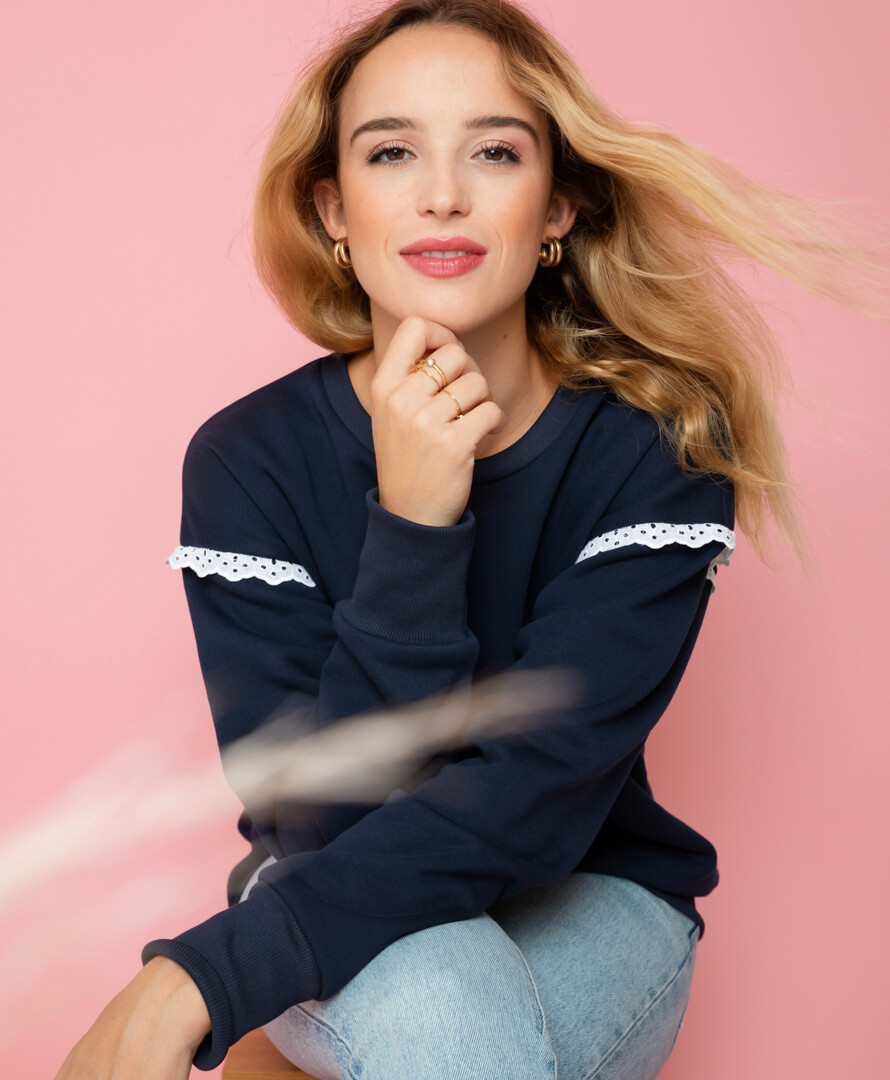 Camélia, notre sweat favori revisité dans une version marine. Son galon de broderie anglaise cousu au niveau des épaules lui apporte la touche féminine qui fait la différence.