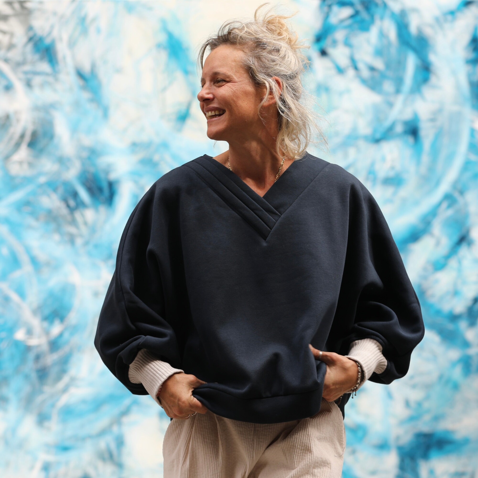 Ferdinand, un joli sweat doux et chaud, avec une manche kimono resserrée par un bord-côte ficelle. Son encolure en V, soulignée par un jeu de trois plis, lui apporte une allure couture.