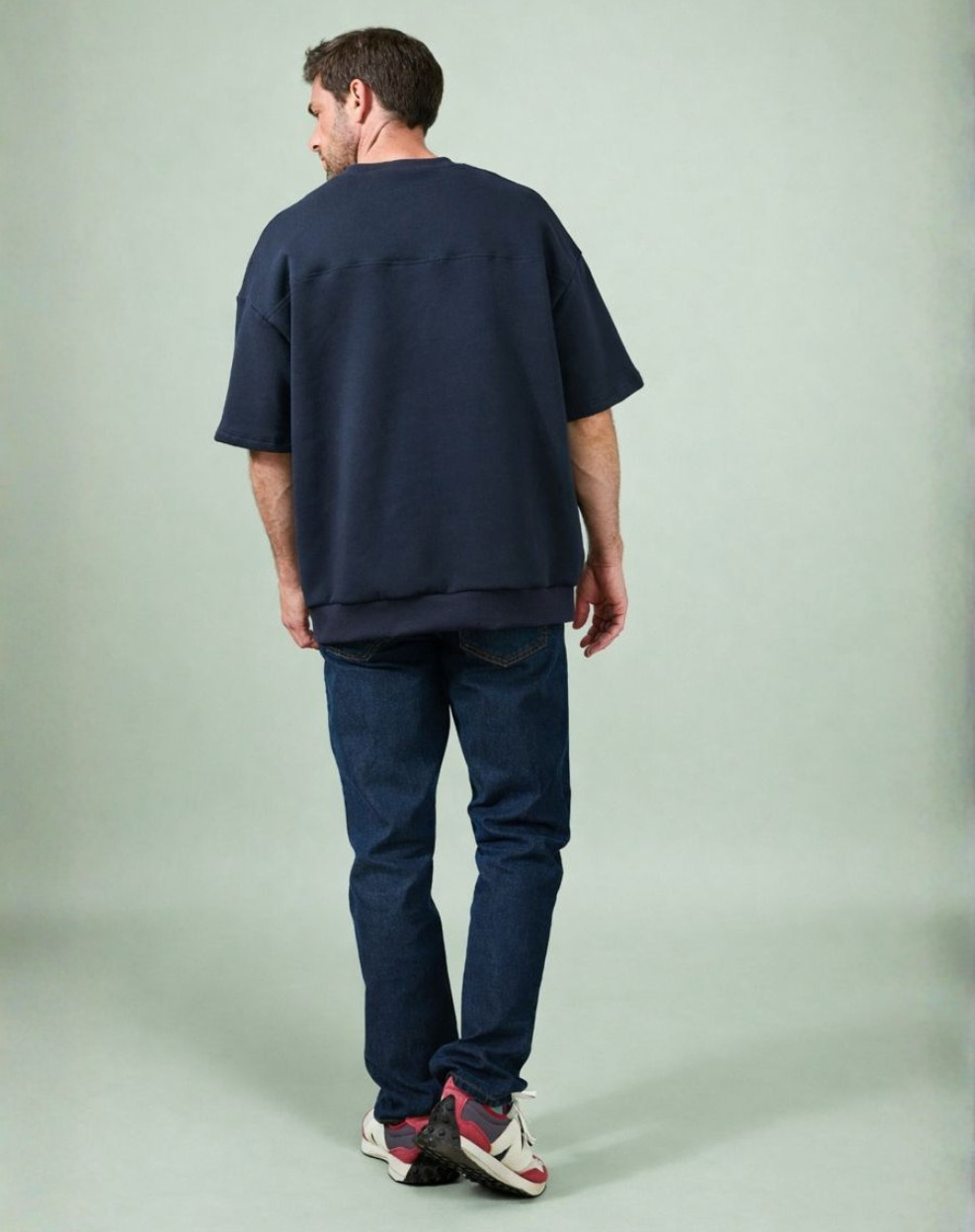 Sweat manches courtes Coton BIO - Marine - Homme | Le t-shirt qu’on rêve d’emprunter et qu’on ne quitte plus ! Sa coupe oversize ultra tendance et ses manches niveau coude donnent tout de suite une allure cool, chic et moderne. Son molleton 100 % coton, à la fois dense et doux, offre un tombé impeccable et un confort enveloppant, sans jamais perdre en style.