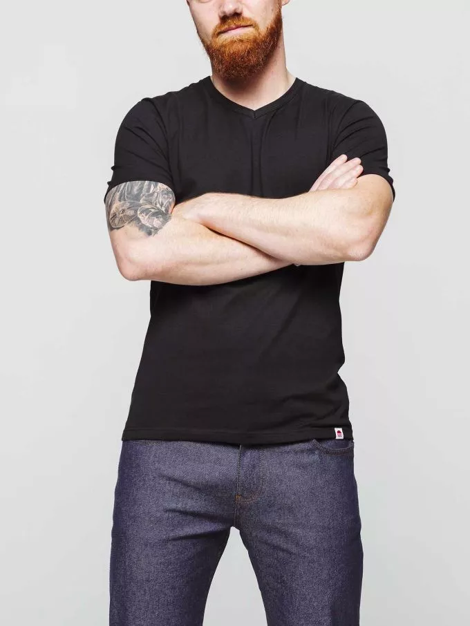 T-SHIRT COL V NOIR 100% FRANCAIS Notre T-Shirt col V en noir est un basique du vestiaire masculin, qui vous accompagne au fil des saisons. Il est dessiné + tricoté + teint + coupé + confectionné en France.