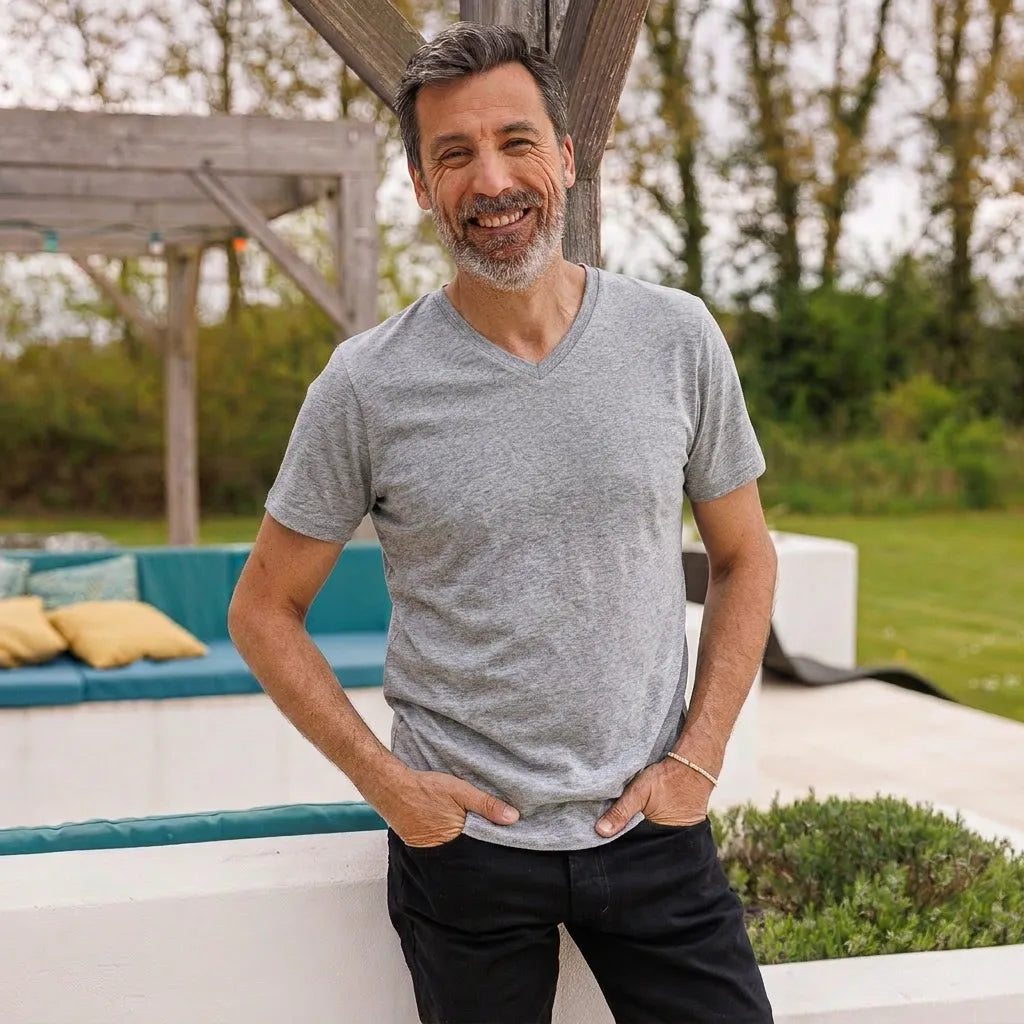 t-shirt col V gris homme PALABA: l'élégance française en coton bioDécouvrez le t-shirt col V gris pour homme de PALABA, une pièce essentielle qui allie confort, style et engagement éthique. Fabriqué en France avec du coton 100% biologique, ce t-shirt est conçu pour les hommes soucieux de la qualité et de l'environnement.