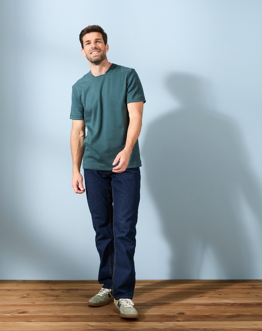 T-shirt épais col signature en Coton Bio - Cèdres - Homme | Ce t-shirt manches courtes n’est vraiment pas un basique comme les autres. Sa découpe graphique sur le haut du buste attire le regard et met en valeur le haut du corps tout en subtilité.