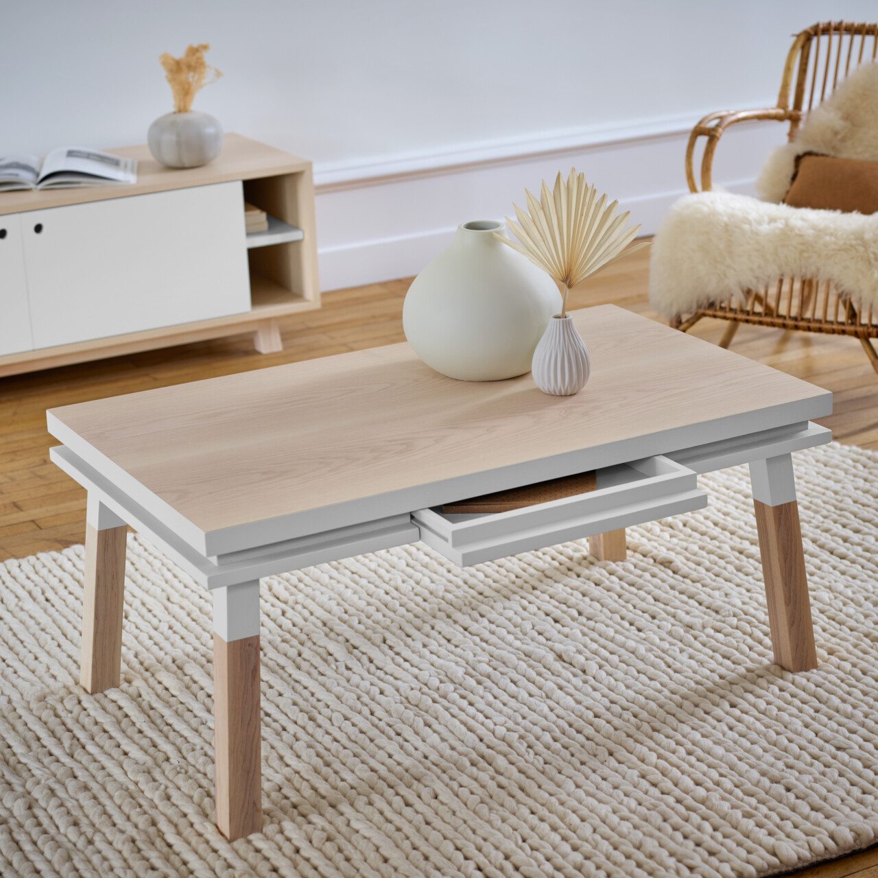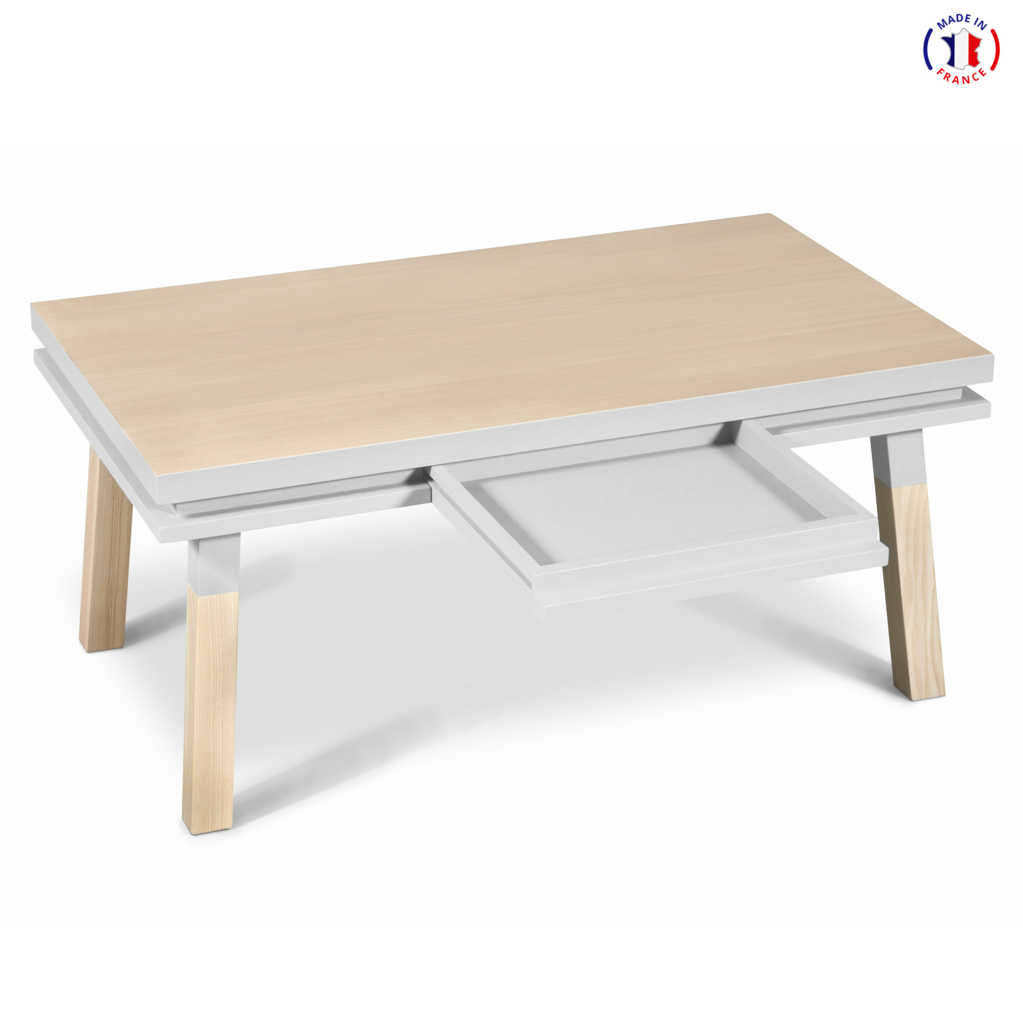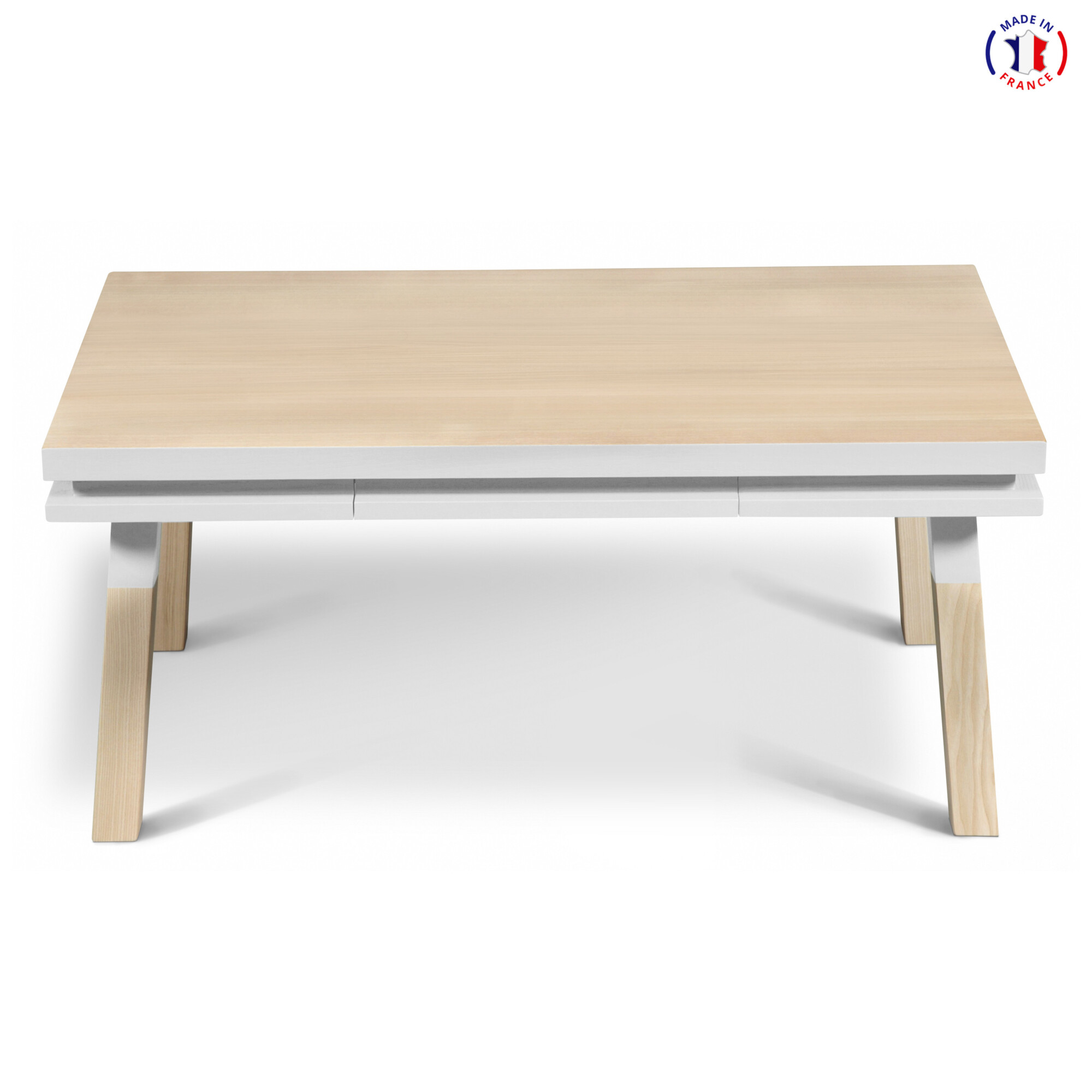 Cette table de salon rectangulaire est présentée ici 100% en frêne massif et est également disponible en chêne. 1 tiroir en bois quasi invisible est intégré dans la ceinture. Elle sera livrée, entièrement montée, chez vous dans la pièce et sur rendez-vous par 2 livreurs.