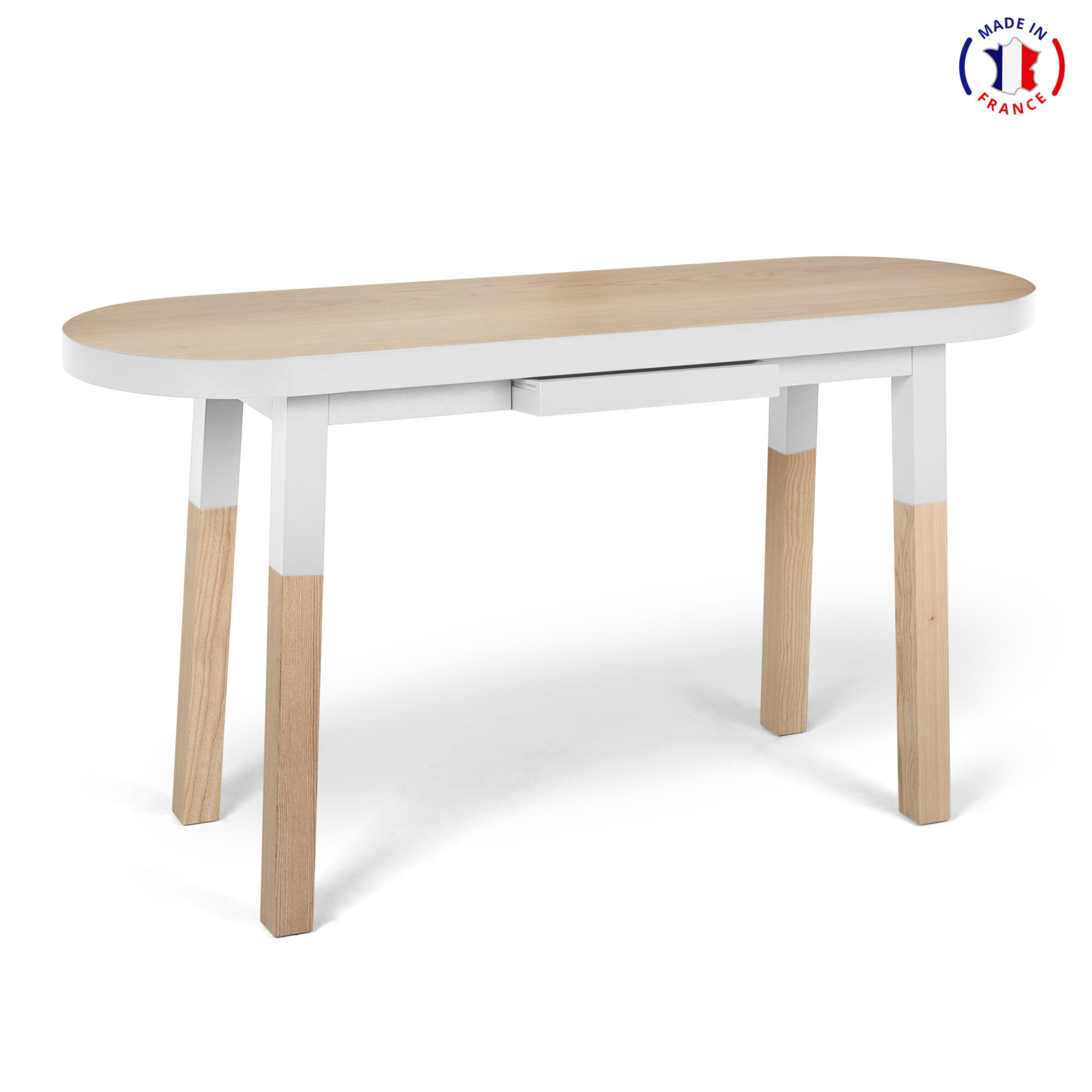 Cette table bureau ovale est présentée ici en frêne massif et est disponible également en chêne.1 tiroir quasi invisible est disposé dans la ceinture du bureau. Ce bureau sera livré, entièrement monté, chez vous dans la pièce et sur rendez-vous par 2 livreurs.