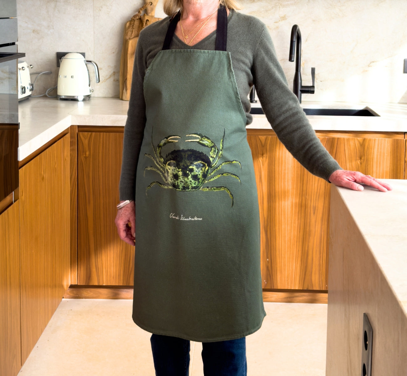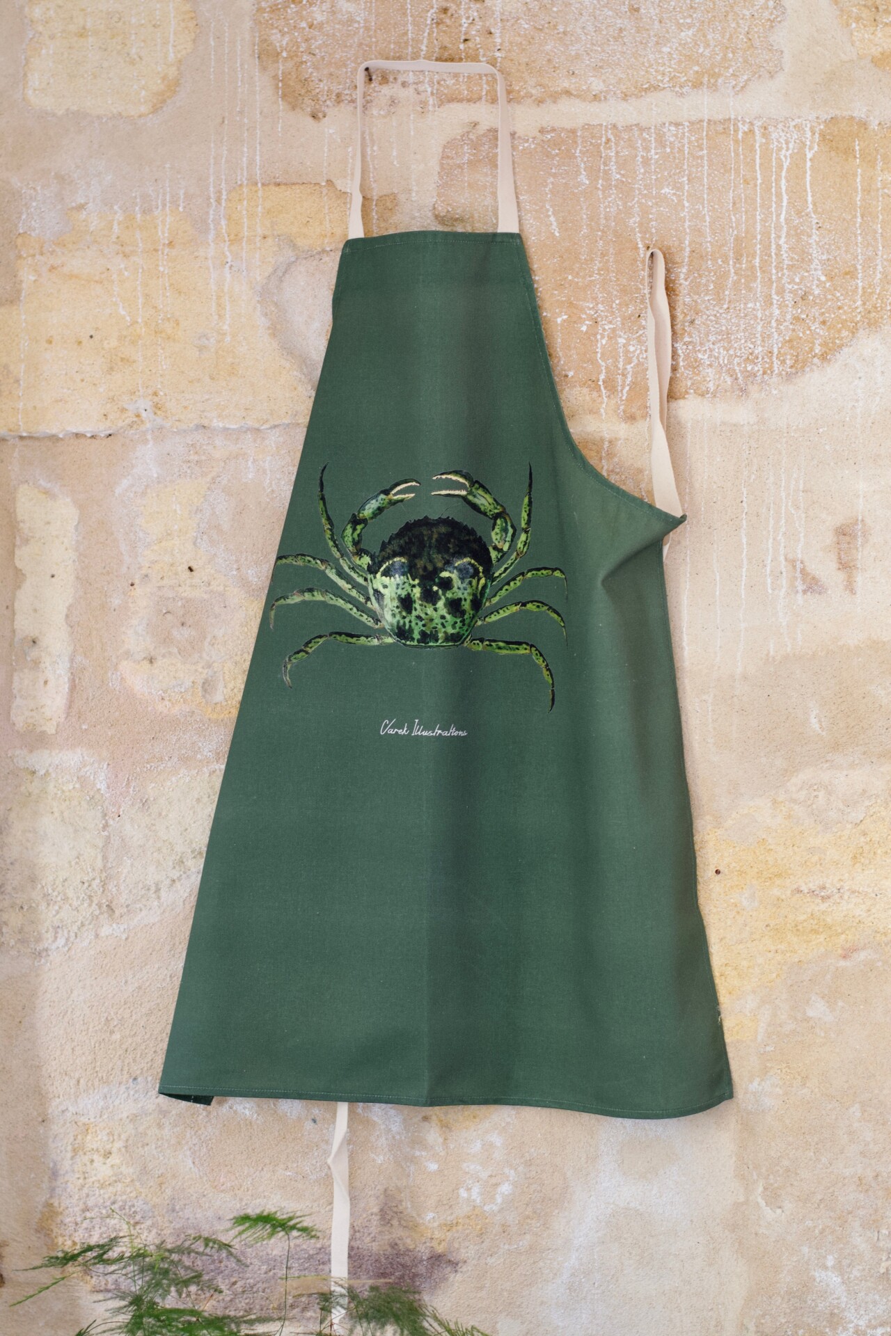 Les Tabliers Varek Illustrations sont confectionnés à la main, en France, dans un atelier provençal. C'est l'alliance parfaite du savoir-faire artisanal et de la passion pour la peinture. Imprimé à même la maille en coton, il est l'allié idéal pour toutes vos préparation culinaires qui sentent bon l'air marin. 100% Coton certifié Oeko - Tex - 210gr/m2 Impression quadrichromie. Confectionné et imprimé en France. Lavable en machine à 60° L'illustration est une reproduction d'un crabe vert peint à l'acrylique par Roméo, peintre & pêcheur.