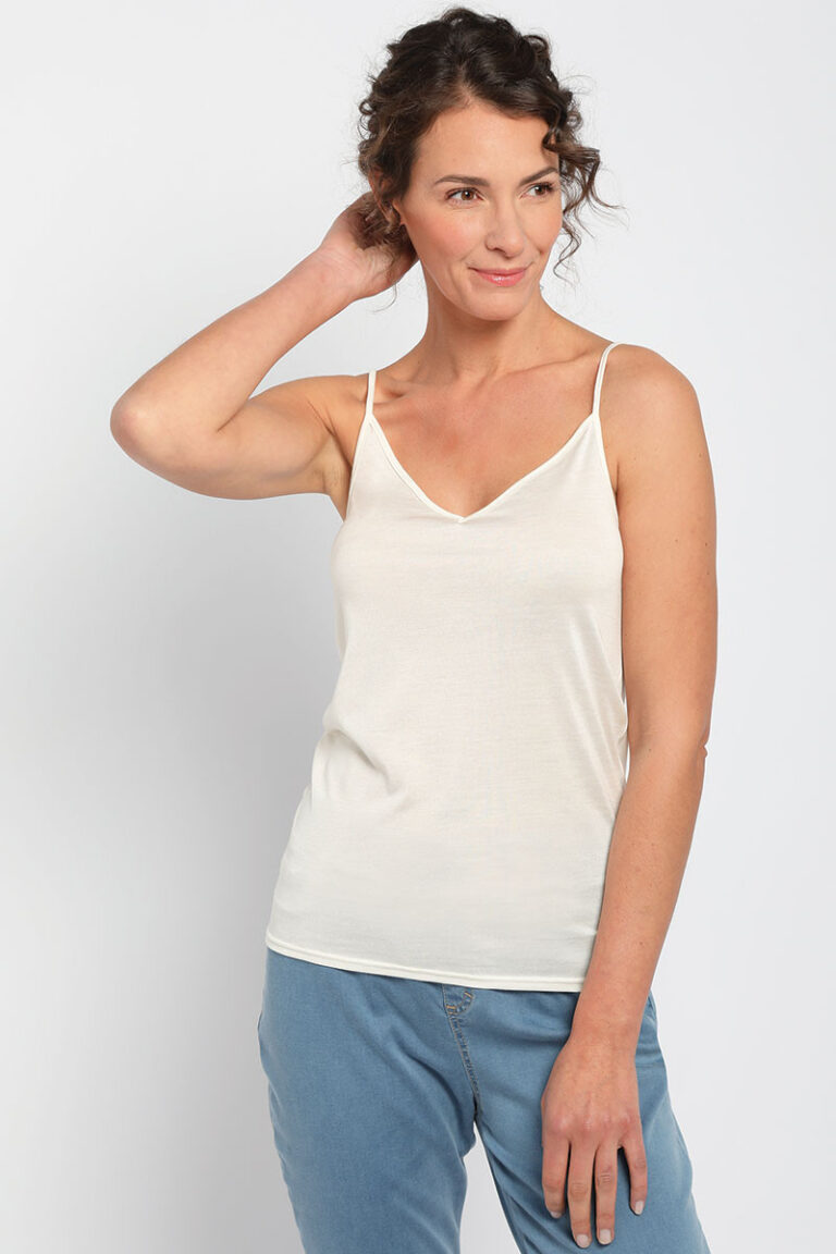 100% soie. Fabriqué en FRANCE. Agréable tee-shirt à fines bretelles en soie