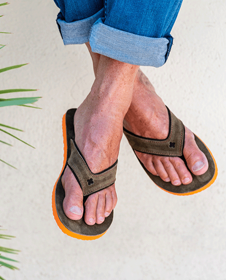 Semelle de dessus et applique en cuir velours Vert. Grâce à sa bride large, ce modèle procure un très bon maintien du pied. L'entre-doigt en microfibre est particulièrement confortable.Tongs Homme certifiées Origine France Garantie.