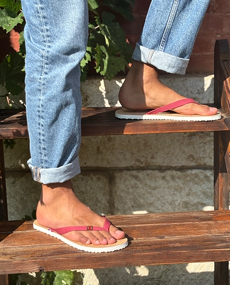 Semelle de dessus en liège naturel. La bride en coton recyclé Bordeaux est très douce pour l'entre-doigt.Tong unisexe certifiée Origine France Garantie.