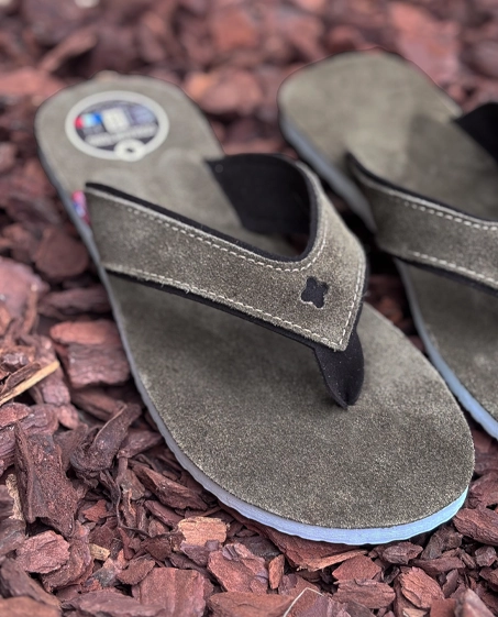 Semelle de dessus et applique en cuir velours Olive. Grâce à sa bride large, ce modèle permet un très bon maintien du pied. L'entre-doigt en microfibre est particulièrement confortable.Tongs homme et femme certifiées Origine France Garantie.