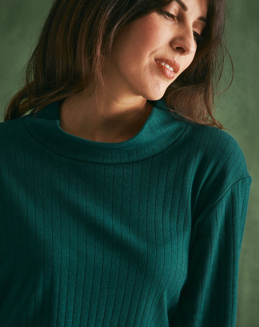 Top laine et coton col montant - Vert cyprès - Femme