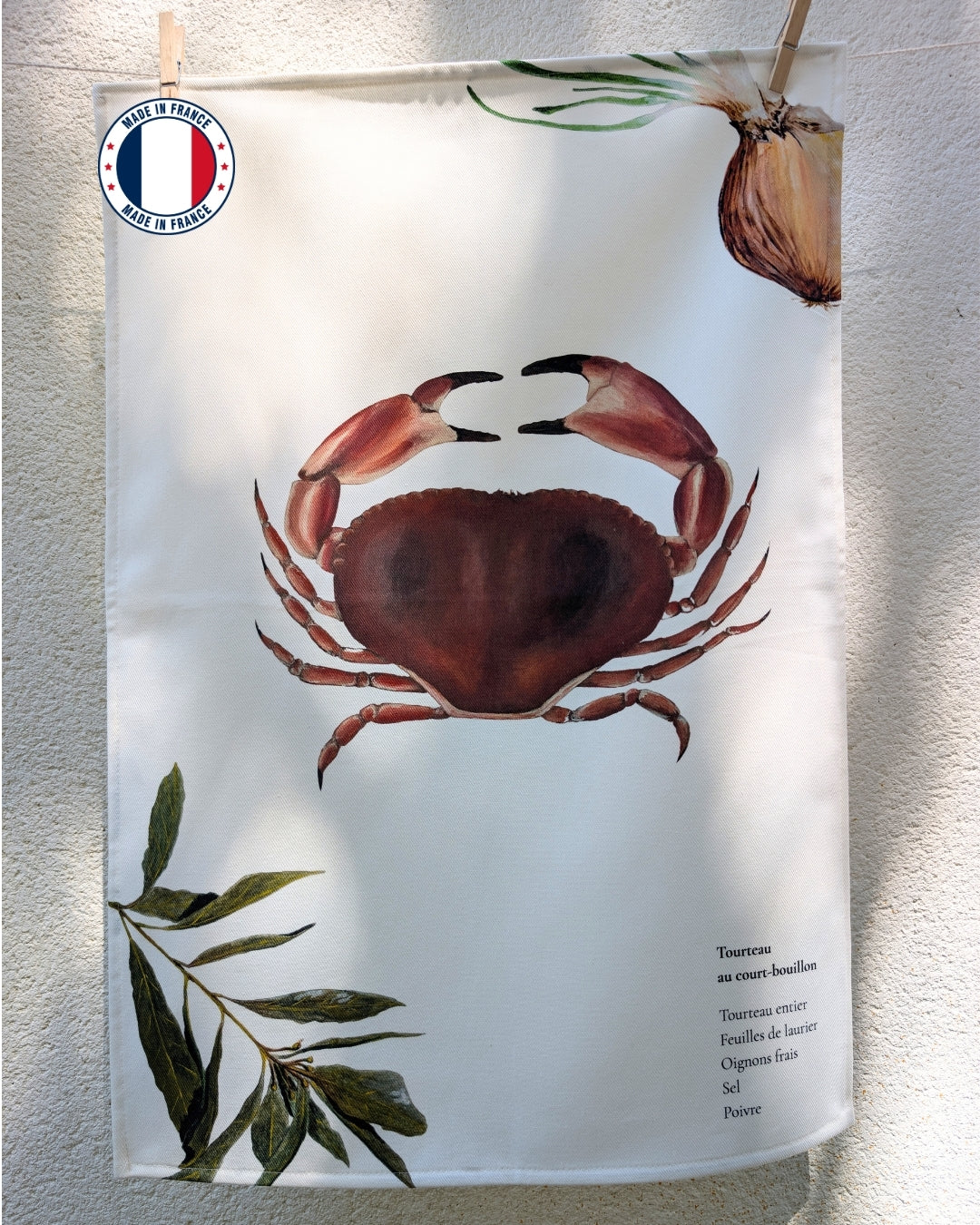 Les Torchons Varek Illustrations sont confectionnés à la main, en France, dans un atelier provençal. Taille : 50 x 70 cm Lavable en machine à 60° 100% Coton certifié Oeko - Tex - 210gr/m2 L'illustration du Tourteau et les éléments de la recette ont été peint à l'acrylique par Côme. Comme tous les torchons en coton, afin que celui-ci soit parfaitement absorbant il convient de le tremper quelques heures dans de l'eau froide avant de le passer au lavage. Suite à son premier lavage, votre torchon Varek Illustrations sera votre meilleur allié dans votre cuisine. Un petit mot sur la recette Tourteau au court bouillon : Tourteau entier Oignons Frais Feuilles de laurier Sel & Poivre Le court bouillon est une recette très simple pour tous les crabes et crustacés. Pour une araignée ou un tourteau prévoyez une cuisson lente d'environ 25 minutes une fois que l'eau est mise à ébullition.