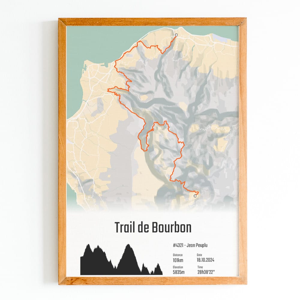 Cette affiche du parcours du Trail Bourbon de la Réunion, course du Grand Raid de la Réunion, est imprimée sur du papier brillant haute qualité.Pour créer un poster personnel et unique, ajoutez votre nom, votre numéro de dossard et votre temps d’arrivée.