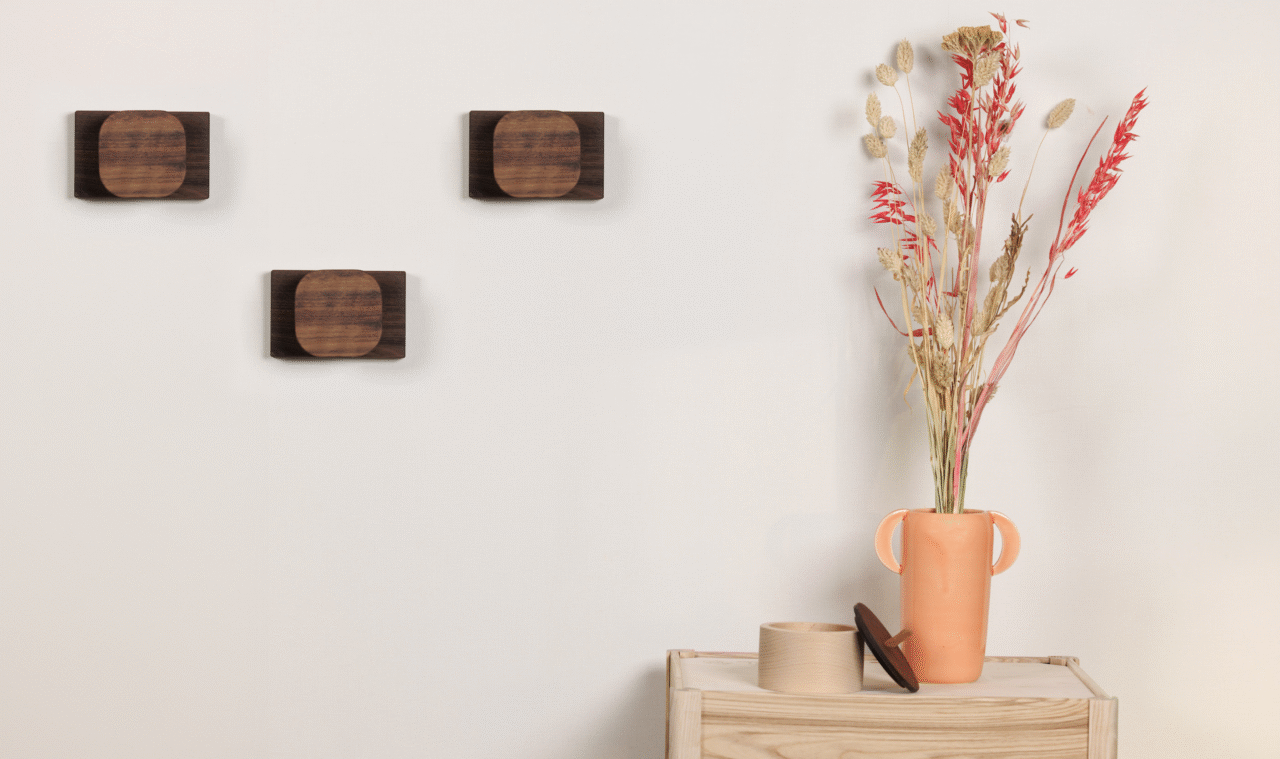 3 petites patères murales individuelles en noyer massif avec son socle assorti, une finition à l'huile écologique qui laisse apparaitre toutes les veines naturelles du bois.