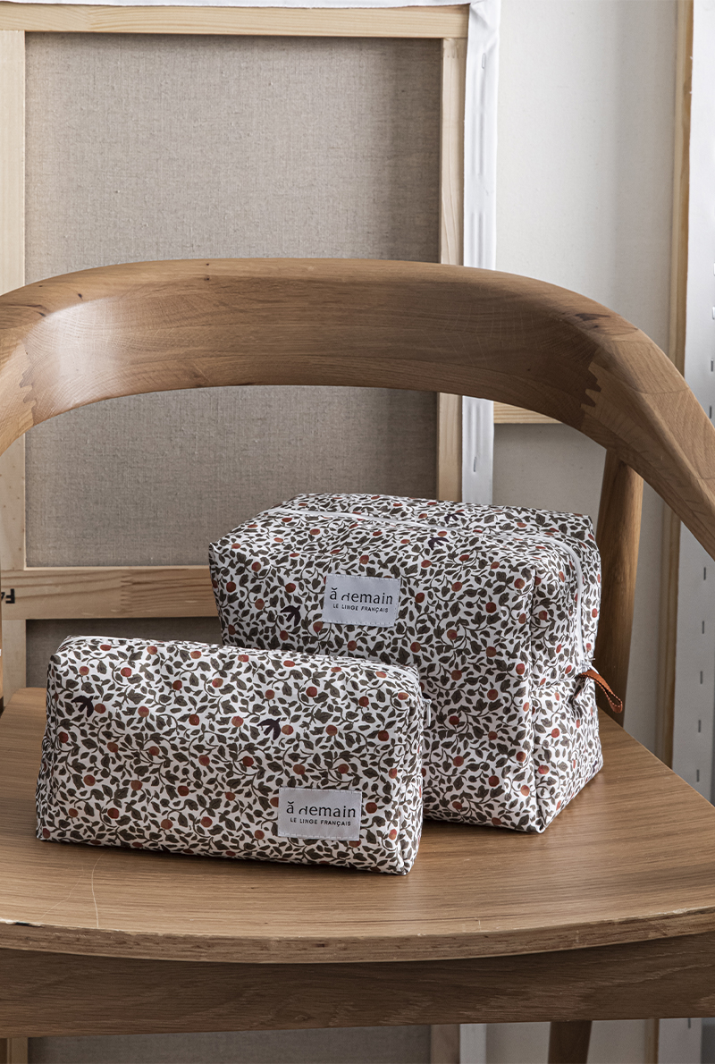 Petit plus, les trousses de toilette A demain sont confectionnées à partir de chutes de linge de lit. Vous pouvez ainsi retrouver vos motifs préférés sur ces pièces uniques et intemporelles !