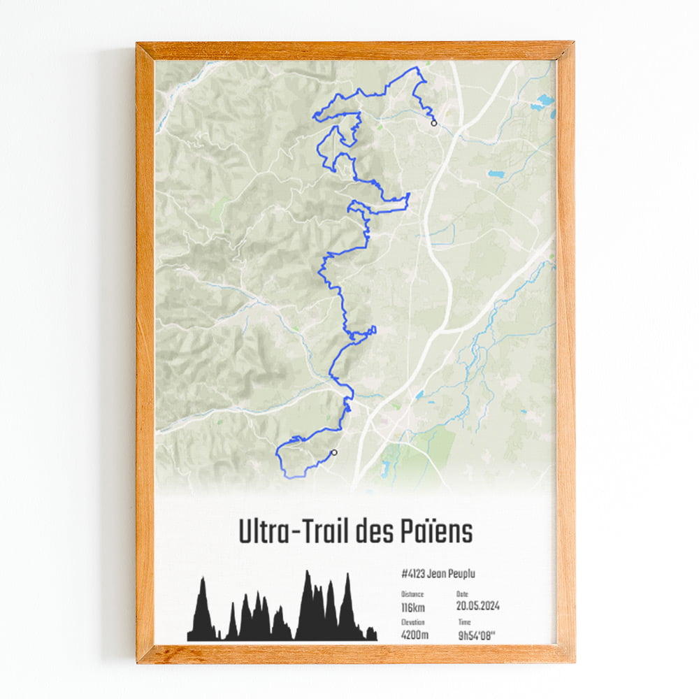 Cette affiche du parcours de l'Ultra-Trail des Païens est imprimée sur du papier photo brillant haute qualité.Pour créer un poster personnel et unique, ajoutez votre numéro de dossard, votre nom, prénom, votre temps d'arrivée ou le texte que vous souhaitez.