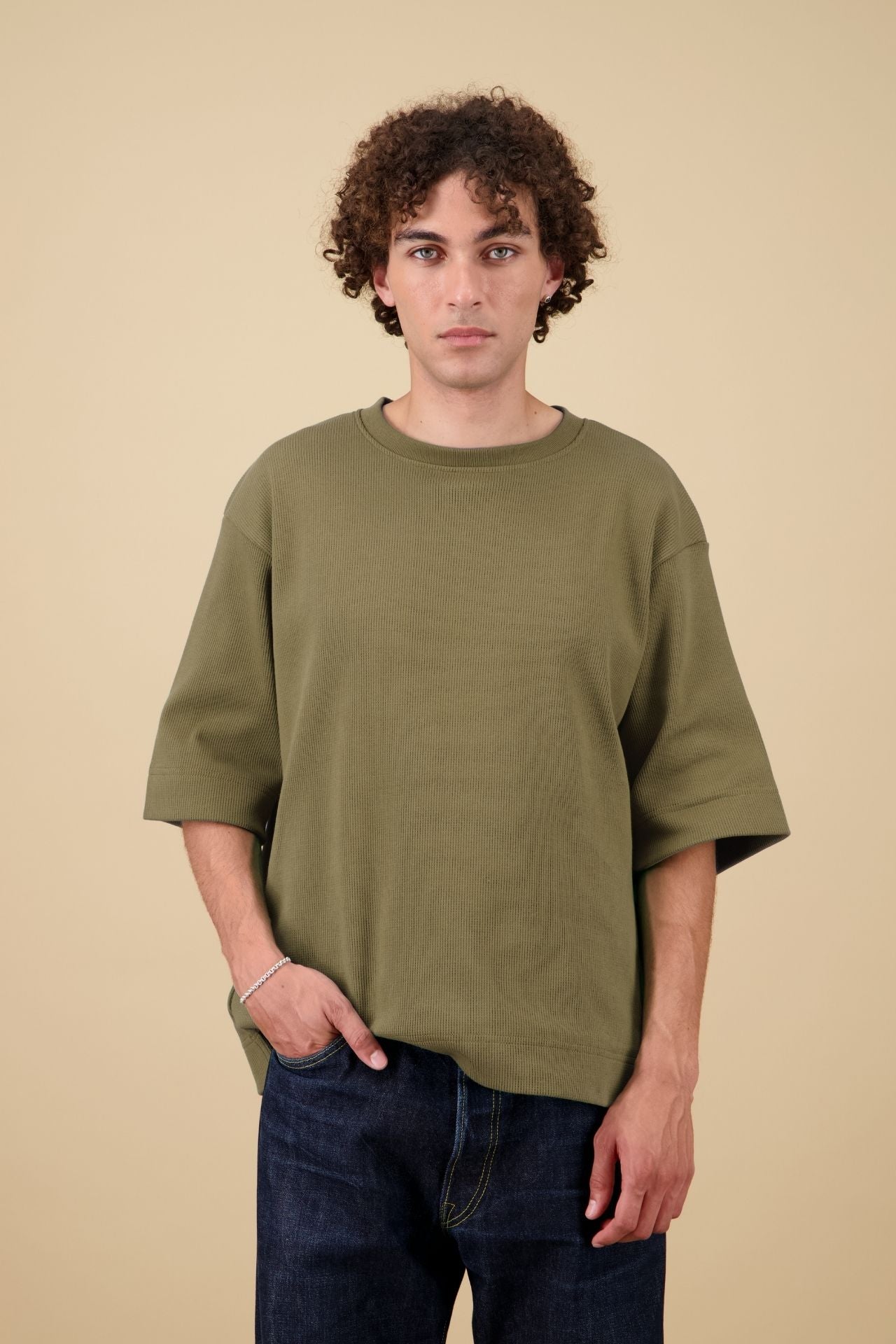 Le modèle Vahé est avant tout une pièce de style. Ni sweat, ni pull, ni t-shirt, il échappe volontairement aux catégories classiques. Nous avons surtout cherché à créer une maille singulière, avec du caractère et une vraie originalité. Tricoté dans une maille très serrée pour garantir robustesse et tenue, il adopte une coupe relax, pensée pour être confortable sans être ajustée ni oversize. Cette version manches courtes reprend l’allure d’un sweat tout en offrant la souplesse et le confort du tricot. Réalisé sur une machine circulaire en jauge 14, avec un point proche d’une maille gaufrée, il présente une texture douce et structurée. Le fil est transformé en panneaux grâce à une machine circulaire située dans un atelier à Troyes, que nous ne possédons pas en interne. La largeur limitée impose une construction en deux parties pour le dos, assemblées par une couture centrale devenue aujourd’hui un véritable détail de style. Matière : 100% coton peigné Tricotage : maille gaufrée en jauge 14, serrée et texturée Couture américaine tout le long du dos Toucher : doux et confortable Poids : 530 grammes