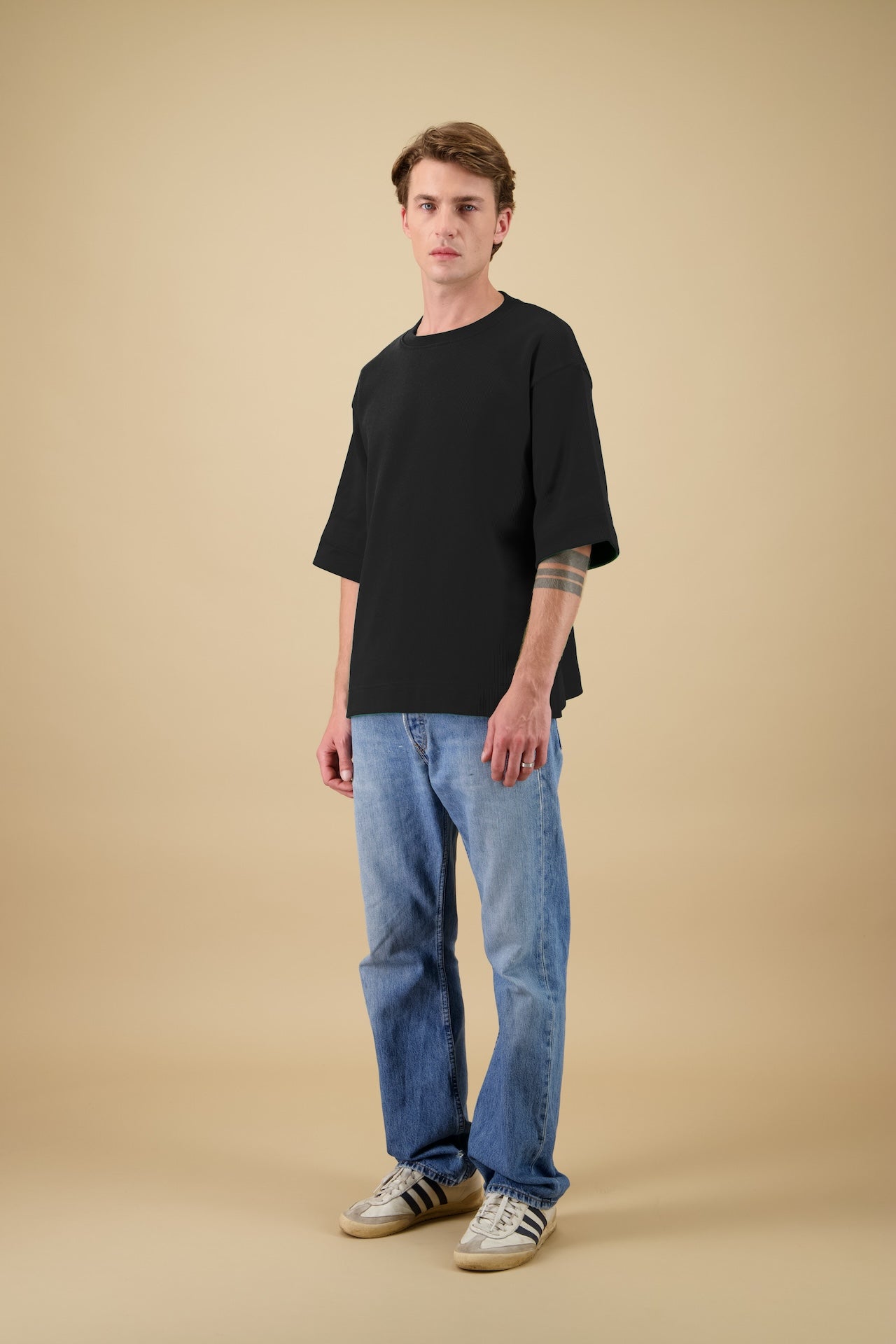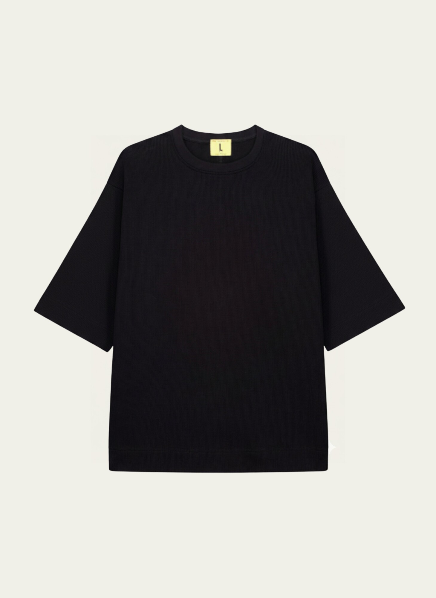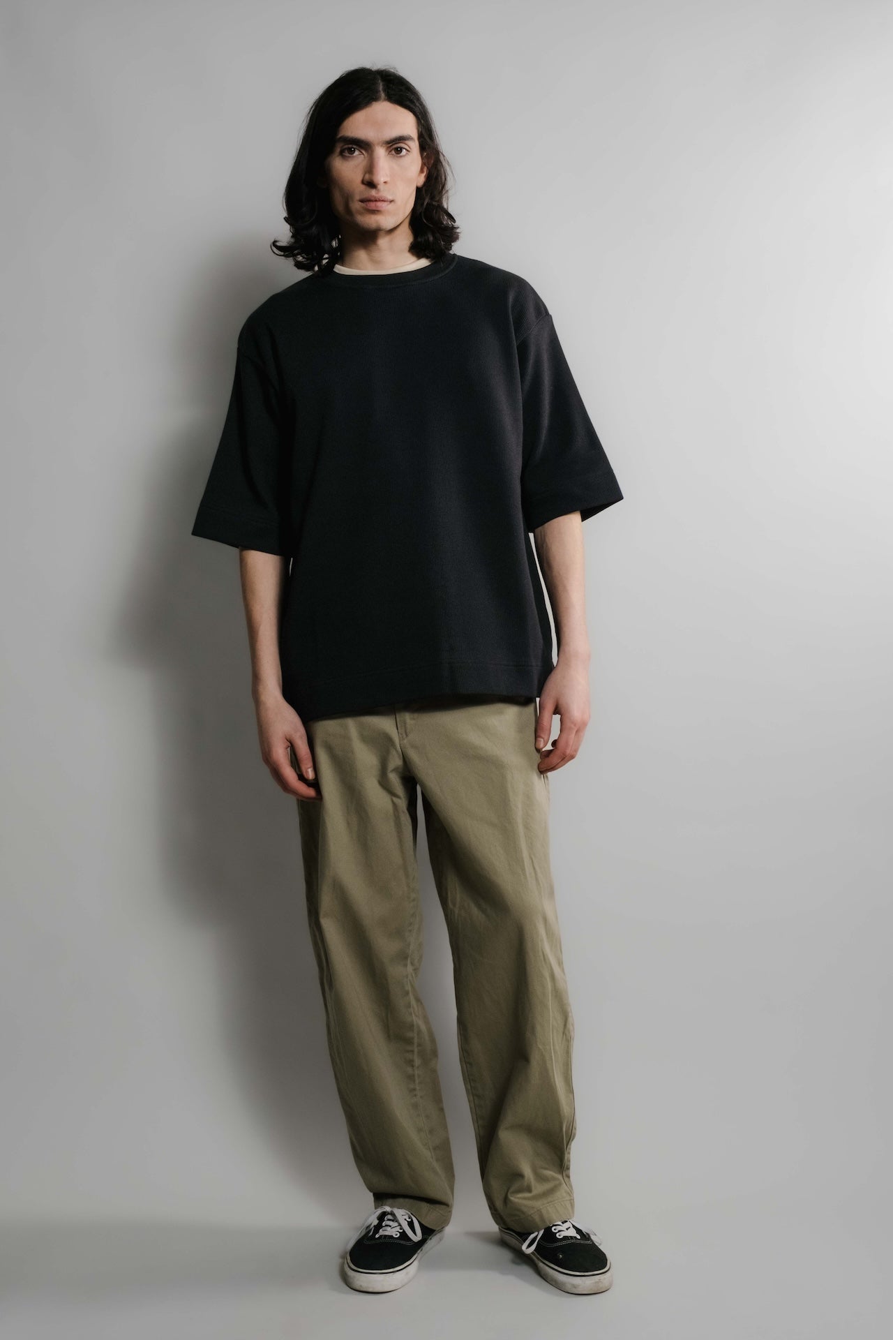 Le Vahé manches courtes est une pièce à part, imaginée uniquement pour le style. Ce n’est ni un sweat, ni un pull, ni un t-shirt. D’ailleurs même nous on ne sait pas comment le caractériser mais encore une fois on a été chercher une maille de caractère pour l’originalité. Sa maille, tricotée très serrée, assure solidité et tenue tout en conservant une coupe relax, confortable et équilibrée. Son allure rappelle celle d’un sweat, mais avec la souplesse et la légèreté d’un tricot. Réalisé en jauge 14 sur machine circulaire, dans un point inspiré d’une maille gaufrée, il offre une texture douce et structurée. Les panneaux sont produits sur une machine circulaire située dans un atelier à Troyes. La largeur limitée impose une construction du dos en deux parties cousues ensemble. Initialement technique, cette couture centrale devient un détail visuel fort du modèle. Matière : 100% coton peigné Tricotage : maille gaufrée en jauge 14, serrée et texturée Couture américaine tout le long du dos Toucher : doux et confortable Poids : 530 grammes en taille L