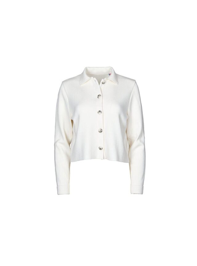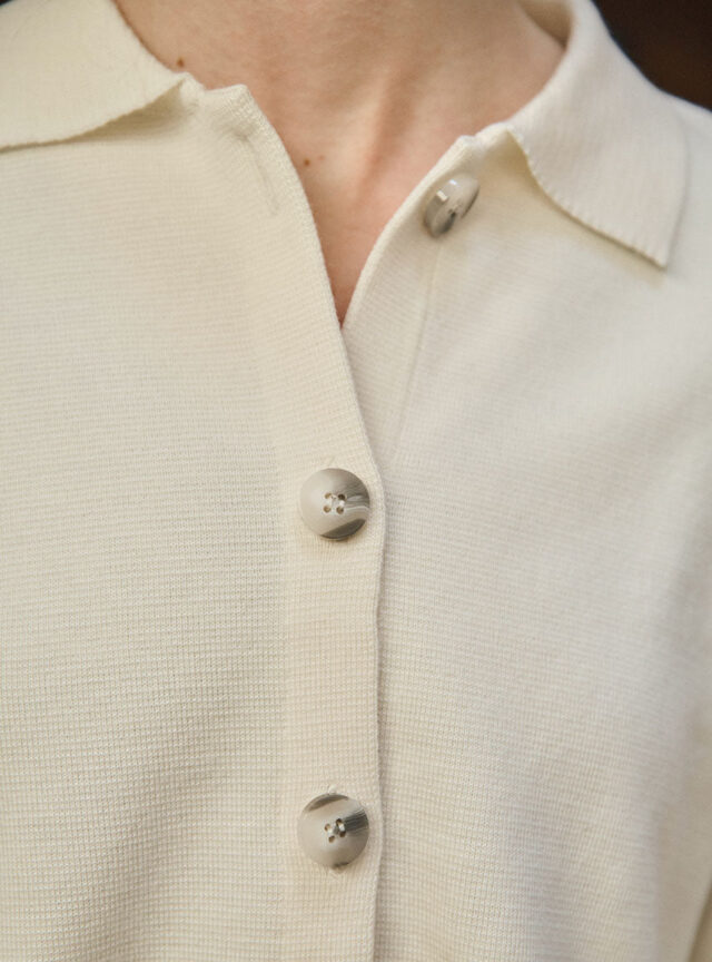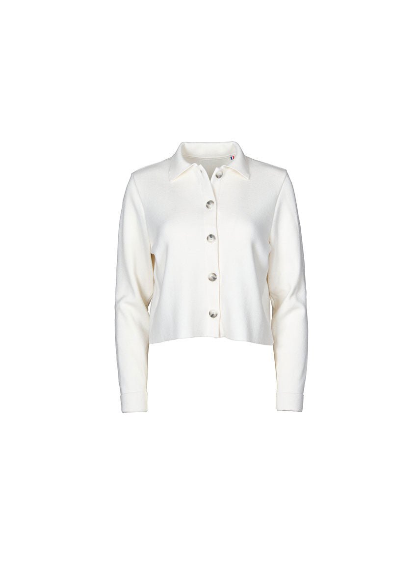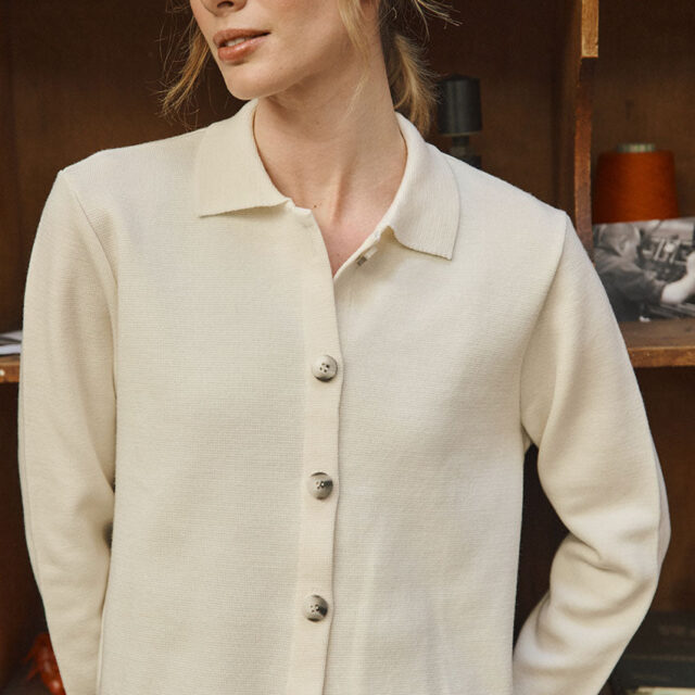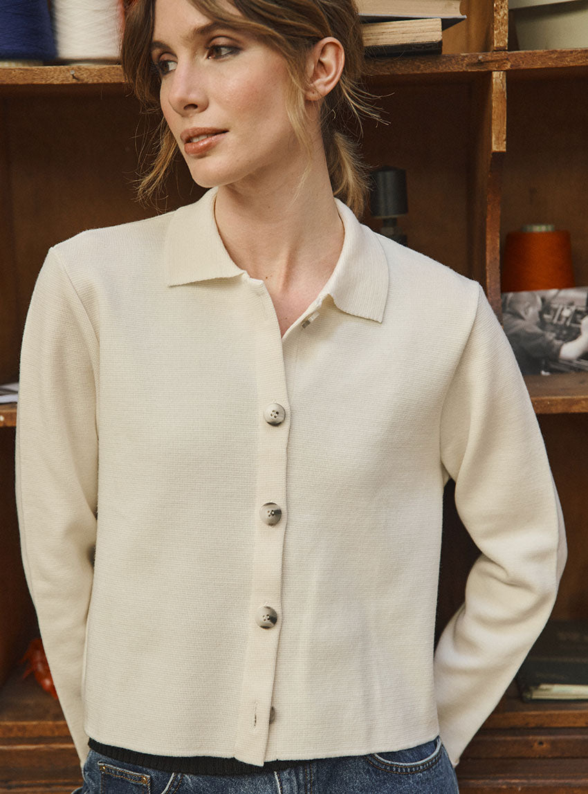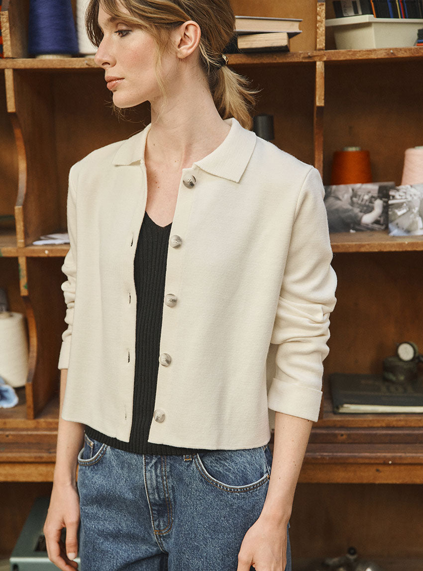 La veste Armelle en blanc naturel séduit par son style épuré et chic. Tricotée en maille Point de Rome au tombé structuré, elle adopte une coupe courte avec col polo ouvert et emmanchures montées. Sa patte de boutonnage à même, soigneusement repliée et piquée, apporte une finition élégante. Une pièce polyvalente à porter comme un cardigan ou une petite veste de demi-saison.