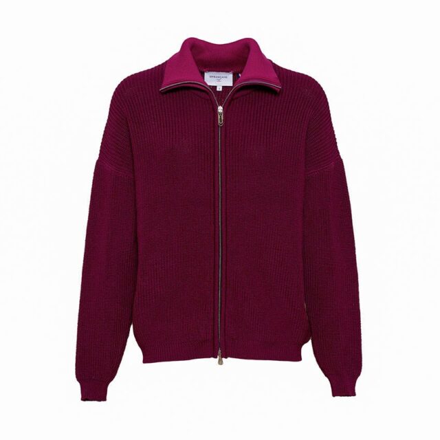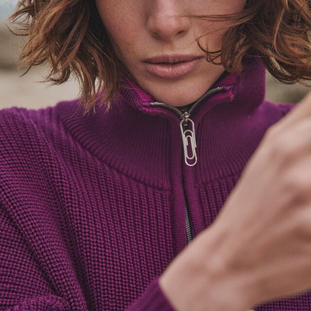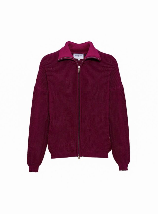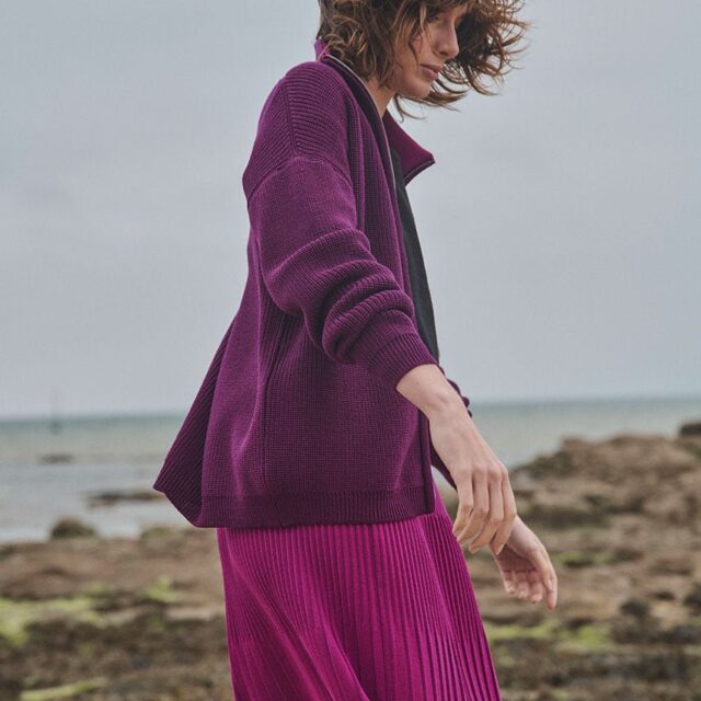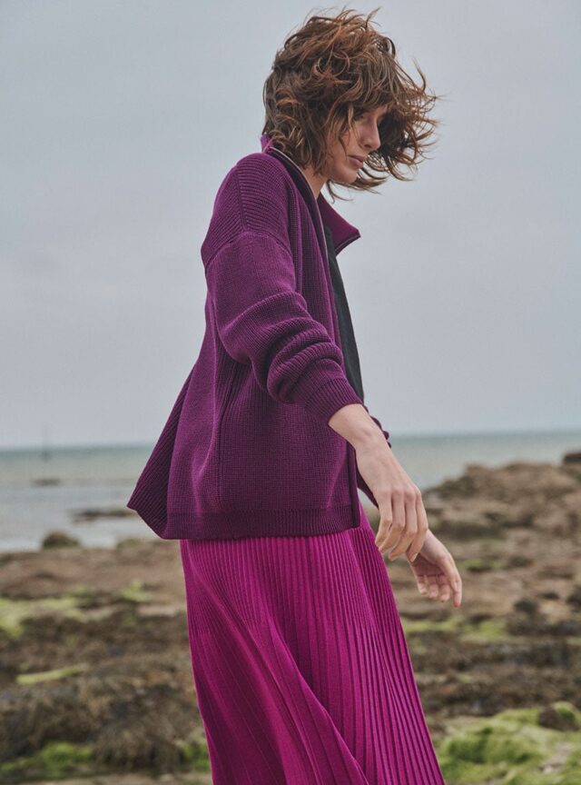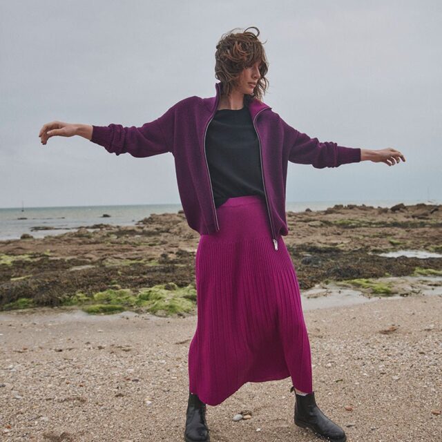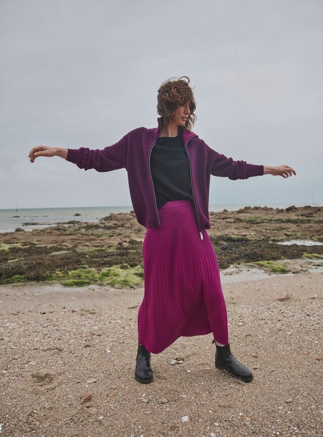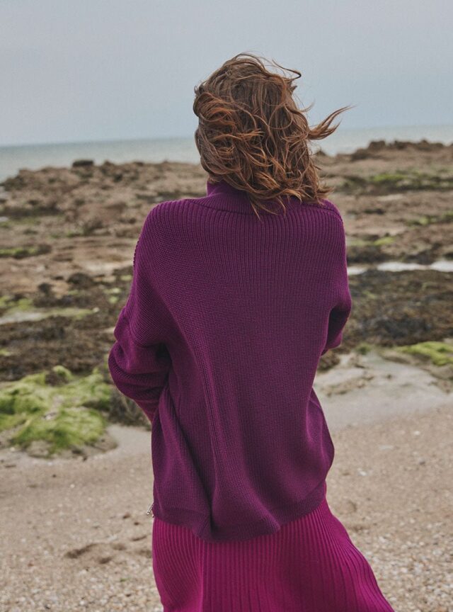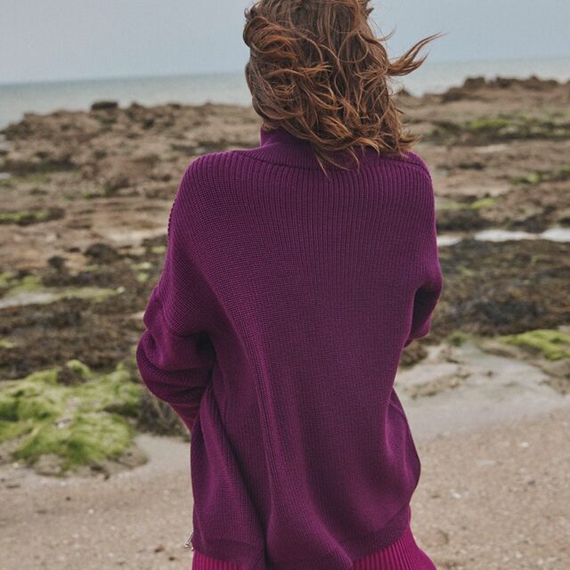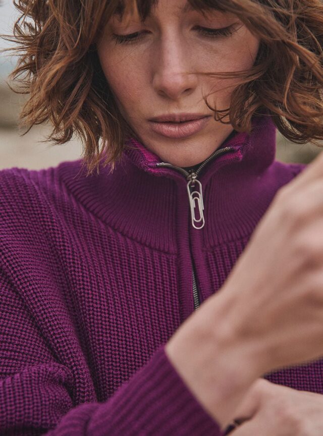 La veste Aurore en violet nuit revisite le pull camionneur dans une version rayée moderne et féminine. Tricotée en maille perlée 100 % laine mérinos fine, elle offre douceur, chaleur et structure. Son col camionneur zippé à curseur trombone et ses emmanchures droites apportent une allure contemporaine. Une pièce forte, idéale en superposition pour un style chaud et affirmé.