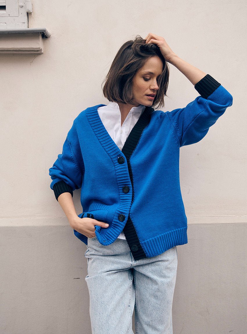 Gilet ou veste oversize bicolore en maille jersey épaisse et laine fine mérinos.