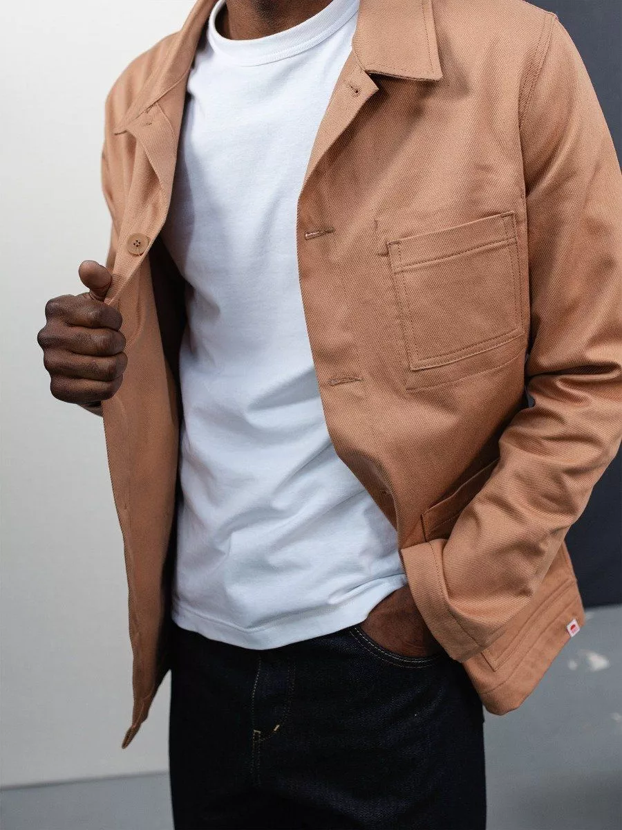 LA VESTE DE TRAVAIL MARRON ARGILE POUR HOMME La veste 703 marron argile s’inspire des vêtements d’atelier traditionnels tout en apportant une touche actuelle et élégante. Sa couleur, douce et naturelle, évoque la terre et s’intègre facilement dans toutes les tenues du quotidien.