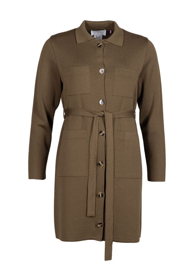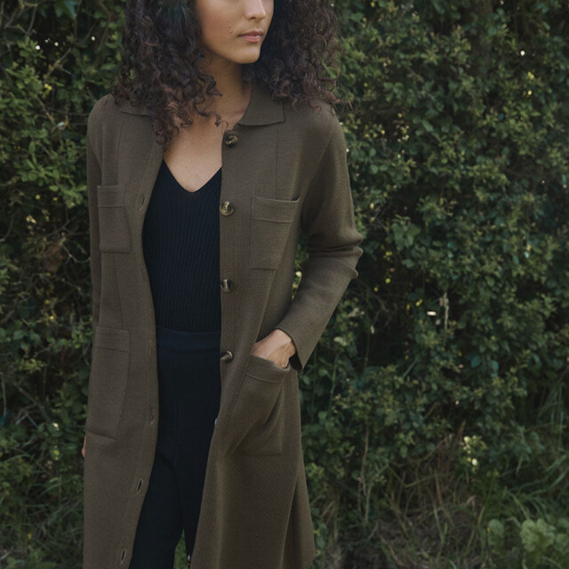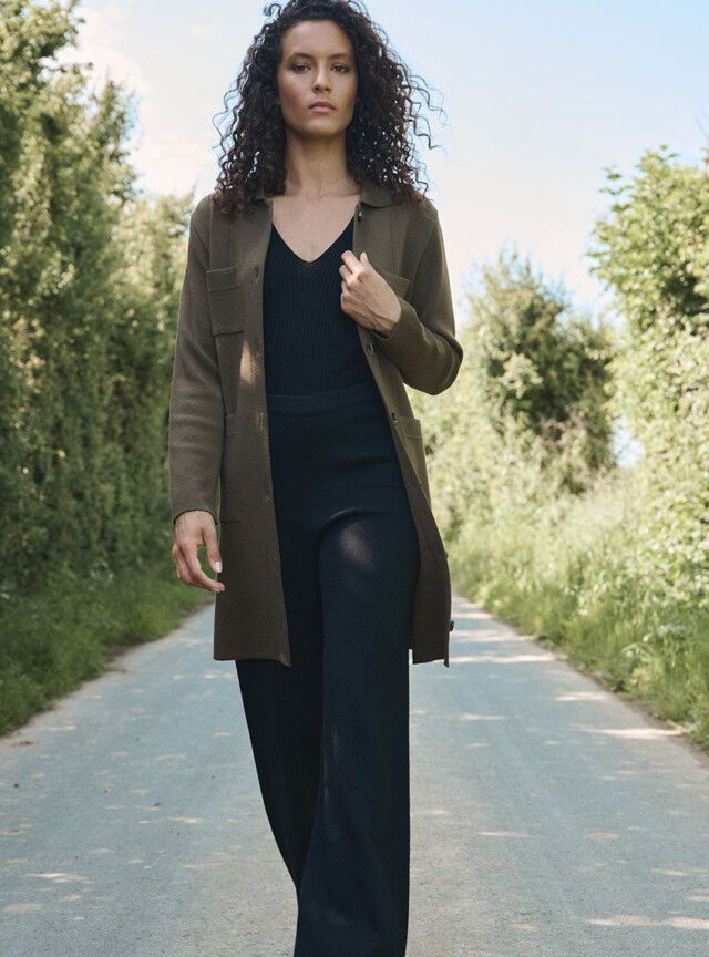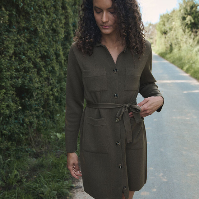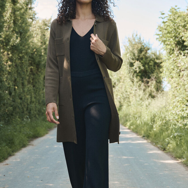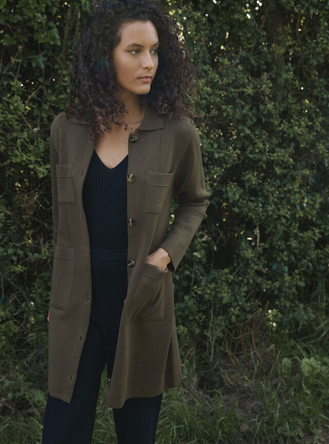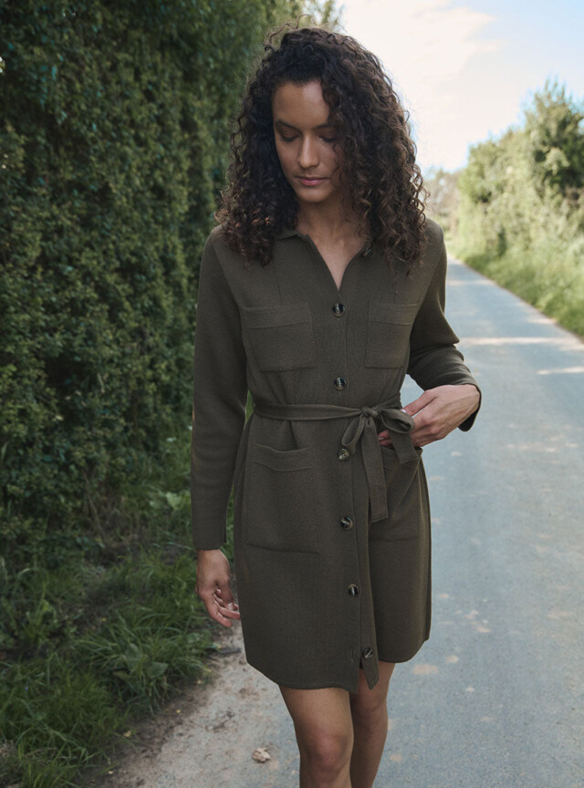 La robe-veste Élise en 100 % laine mérinos fine allie élégance et polyvalence : à porter ceinturée en robe ou ouverte en veste, elle offre confort, douceur et un style intemporel fabriqué en France.