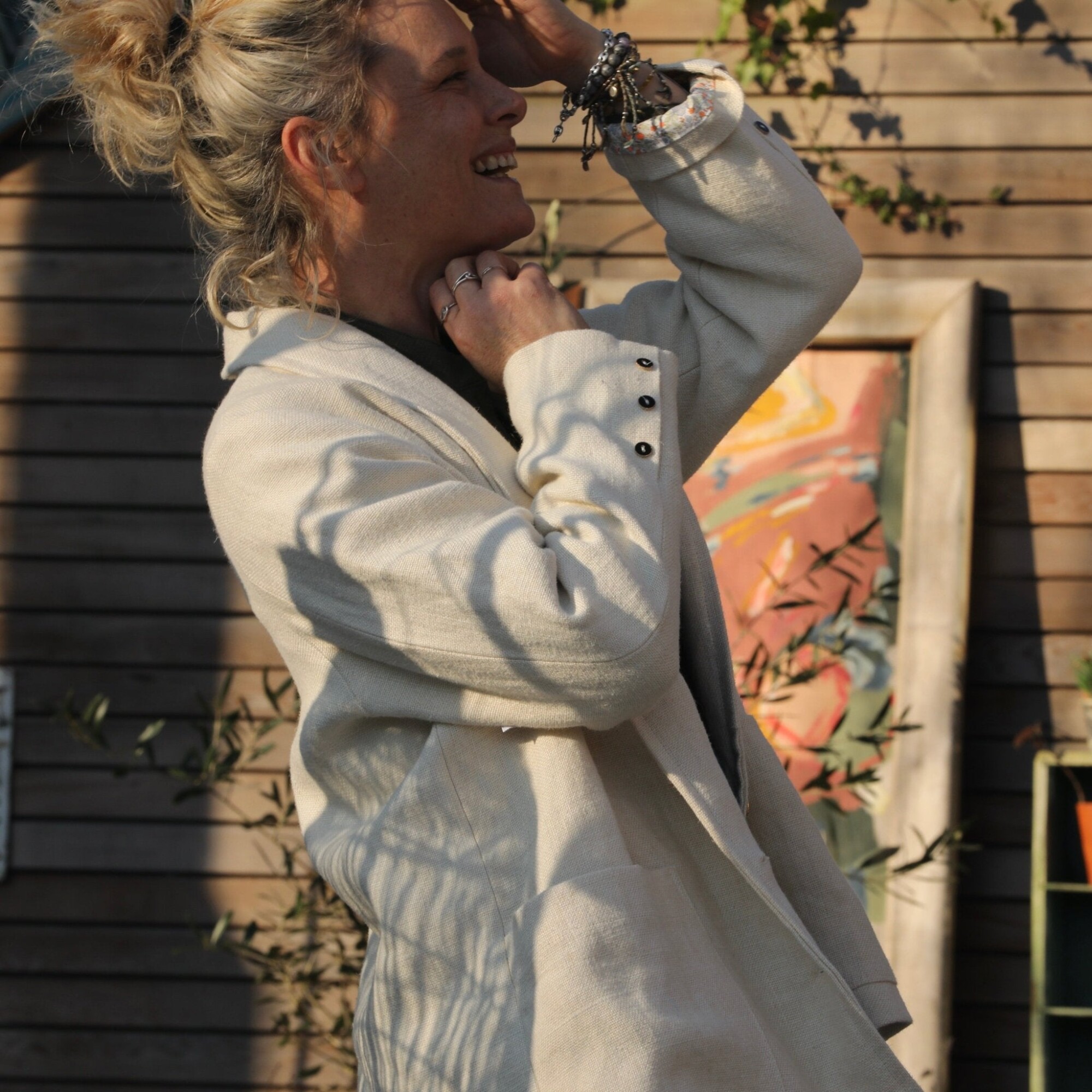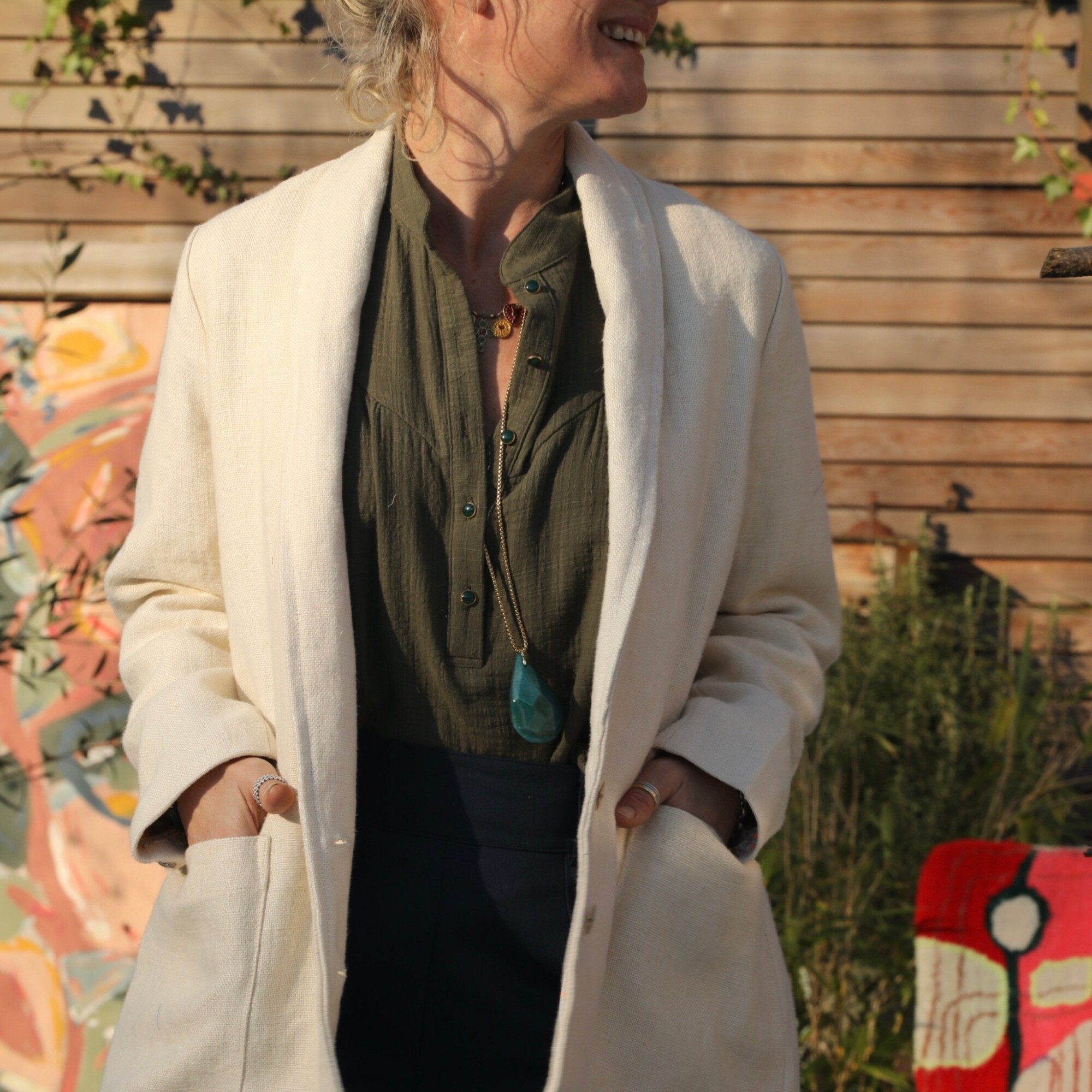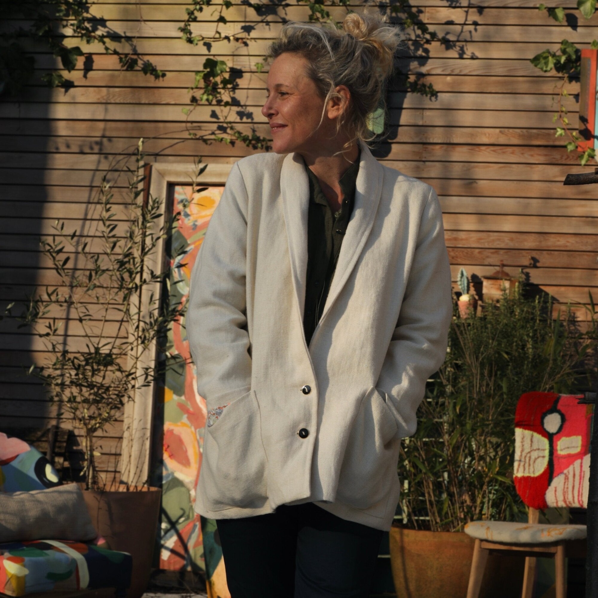 Faustine est une veste à l’allure à la fois casual et chic, avec une coupe droite et un col châle discret. Elle se distingue par de grandes poches rectangulaires intégrées dans les coutures latérales et de jolis boutons français.