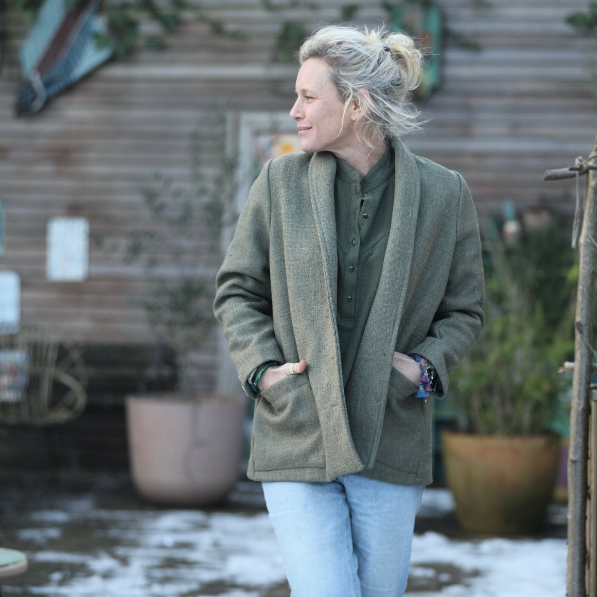Faustine est une veste à l’allure à la fois casual et chic, avec une coupe droite et un col châle discret. Elle se distingue par de grandes poches rectangulaires intégrées dans les coutures latérales et de jolis boutons français.