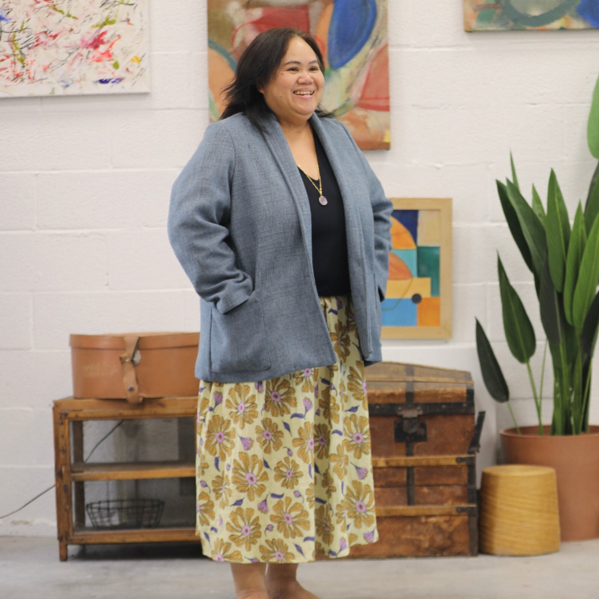 Faustine est une veste à l’allure à la fois casual et chic, avec une coupe droite et un col châle discret. Elle se distingue par de grandes poches rectangulaires intégrées dans les coutures latérales et de jolis boutons français.