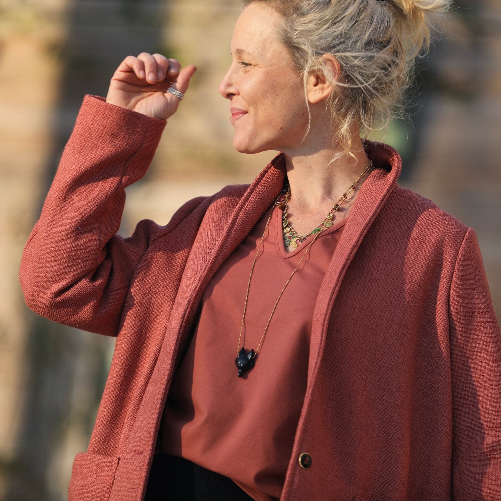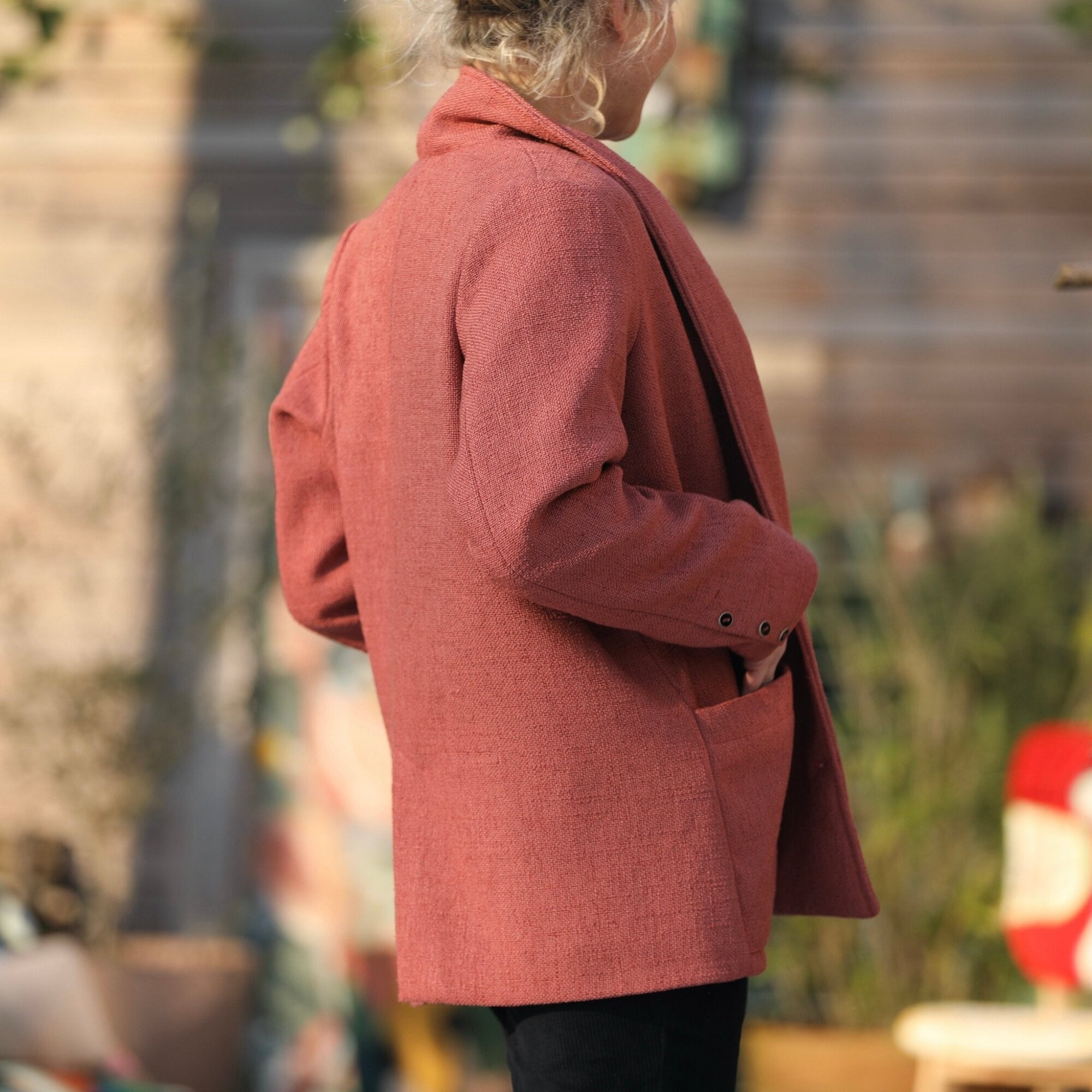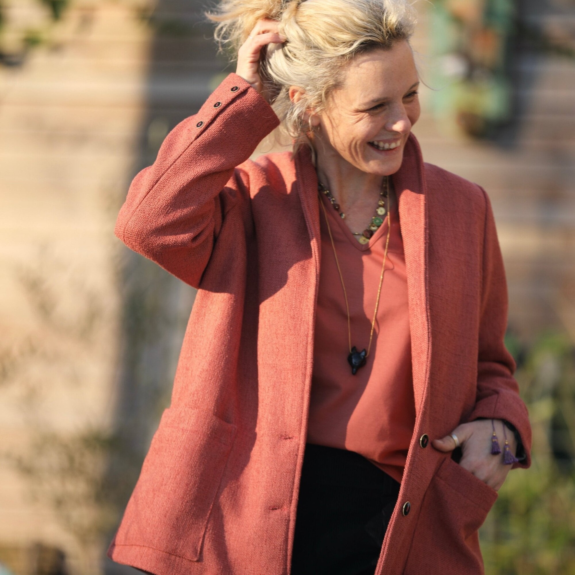 Faustine est une veste à l’allure à la fois casual et chic, avec une coupe droite et un col châle discret. Elle se distingue par de grandes poches rectangulaires intégrées dans les coutures latérales et de jolis boutons français.