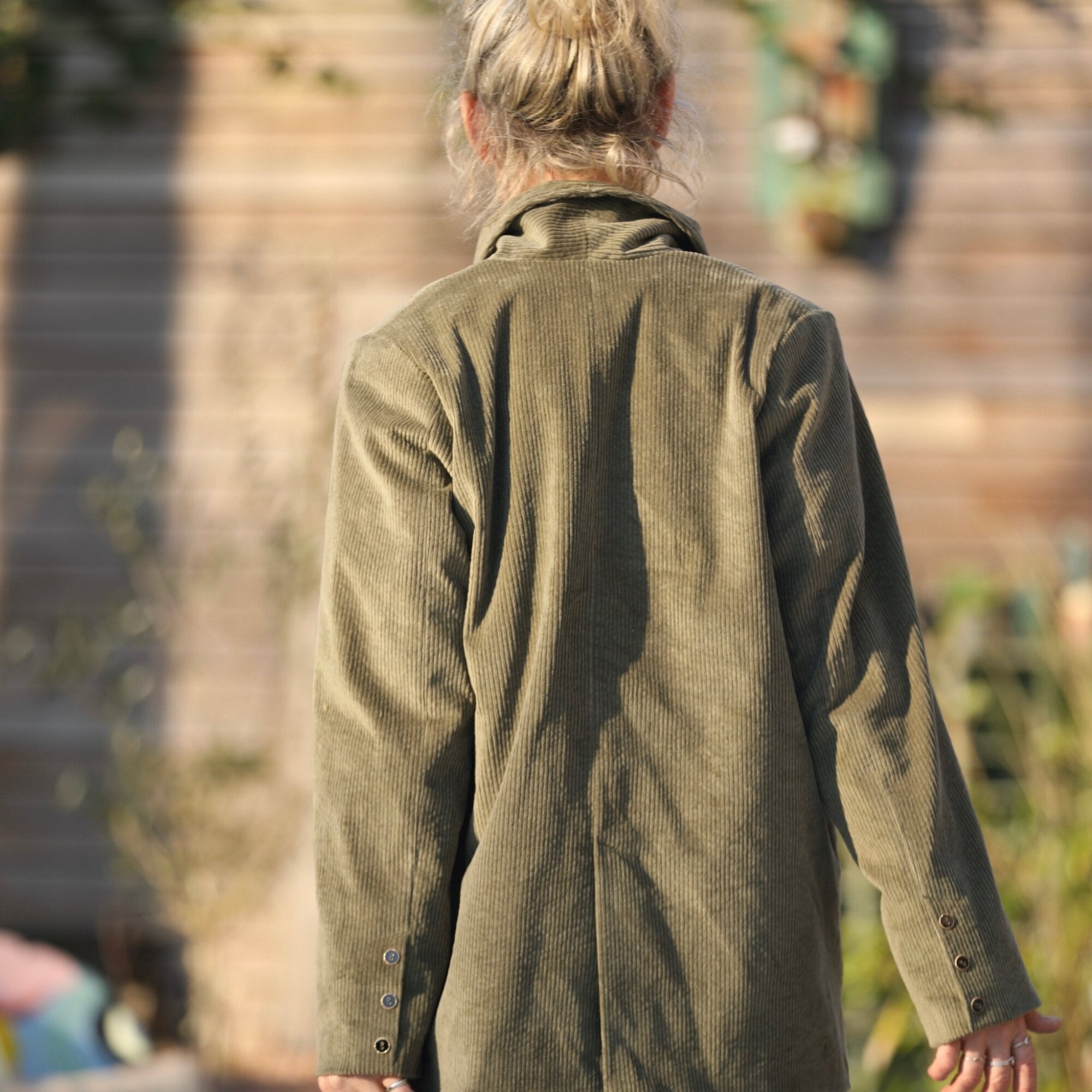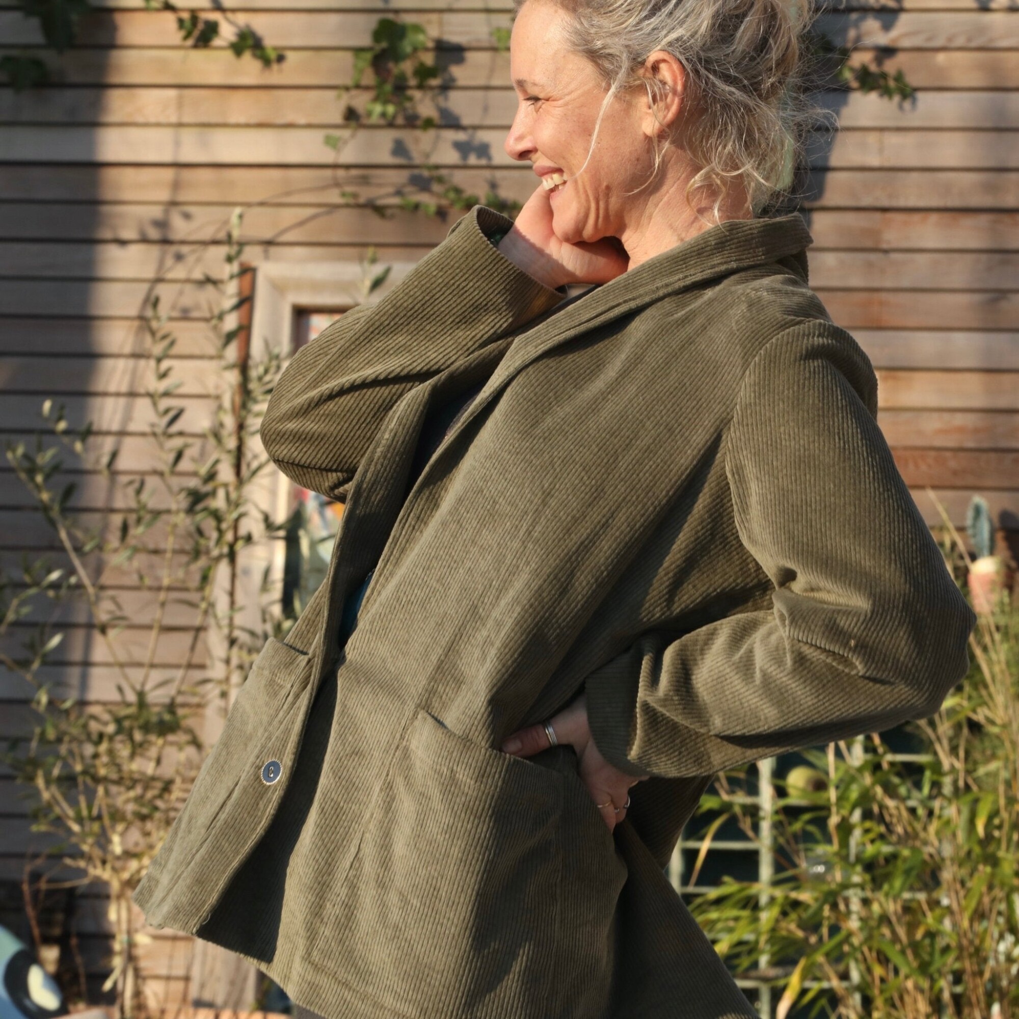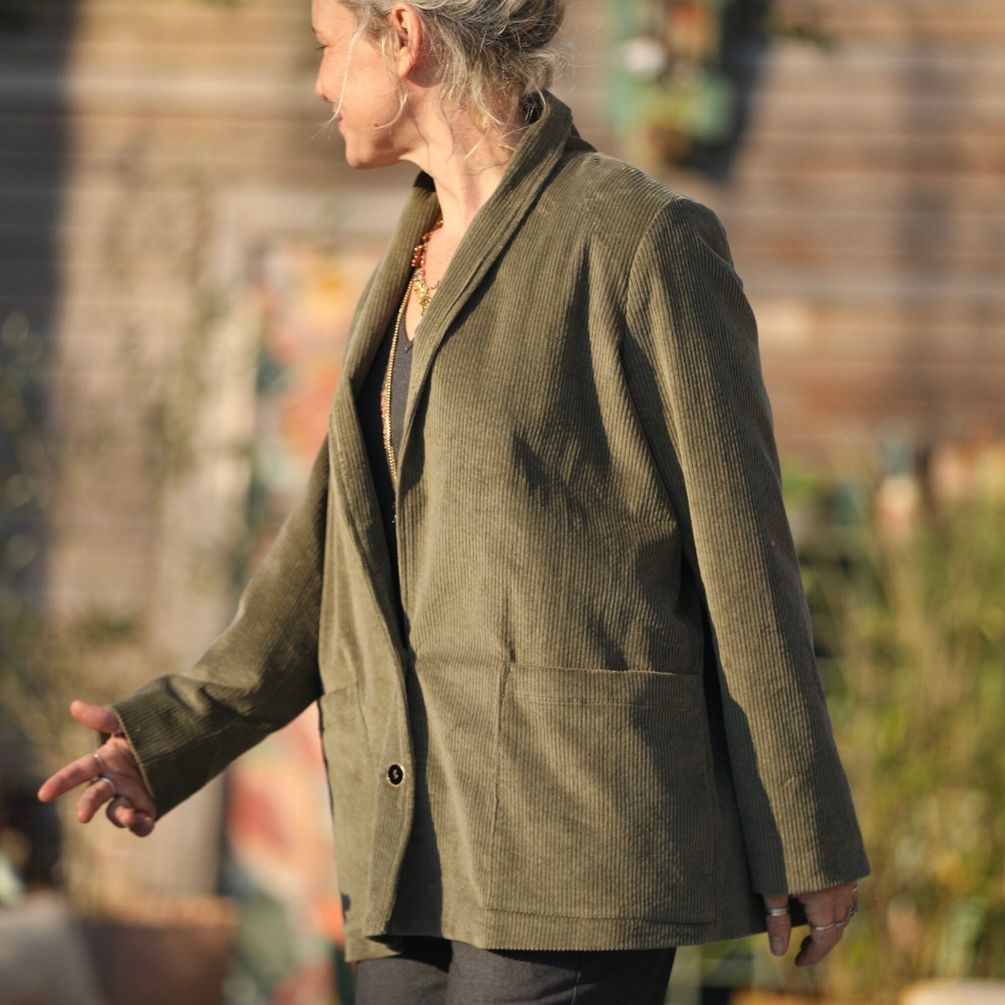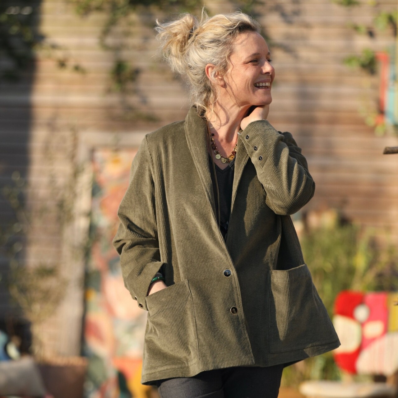 Faustine est une veste à l’allure à la fois casual et chic, avec une coupe droite et un col châle discret. Elle se distingue par de grandes poches rectangulaires intégrées dans les coutures latérales et de jolis boutons français.