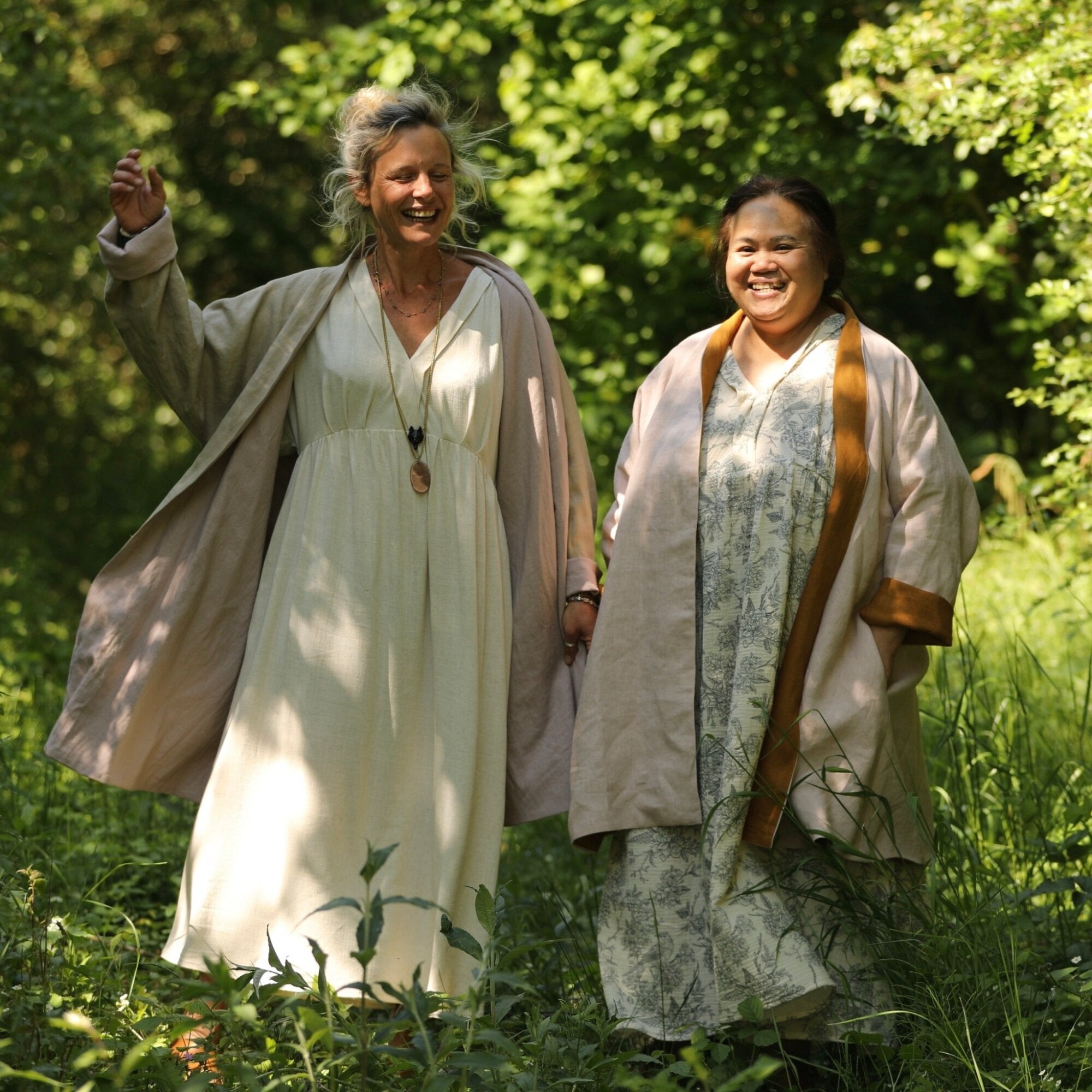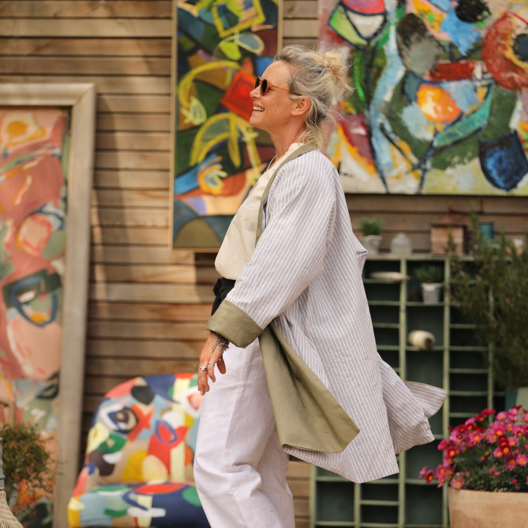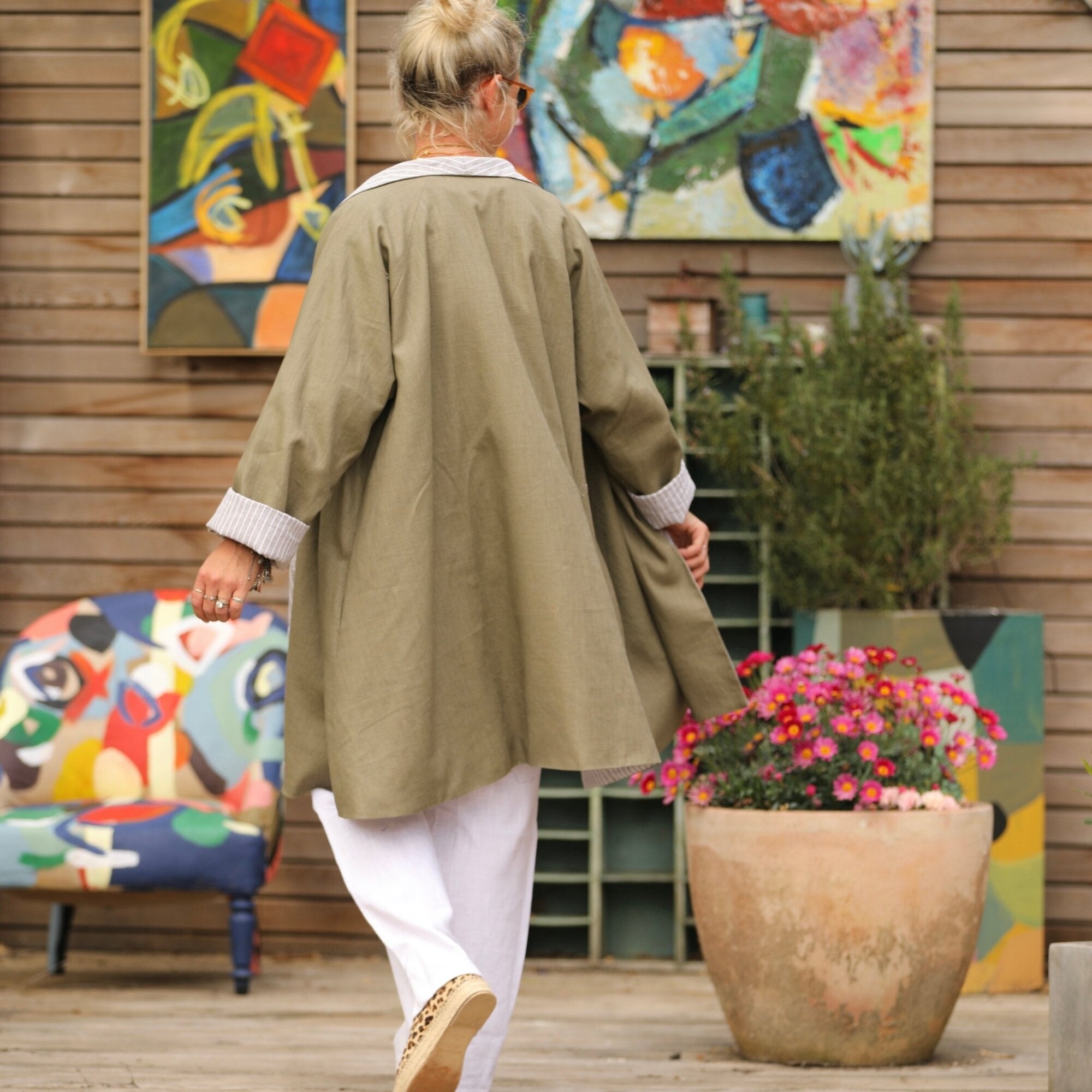 Lisandre est une veste réversible d'inspiration japonaise, confectionnée en lin aux teintes douces. Sa coupe ample, évoquant celle d'une cape, offre une silhouette fluide et élégante.