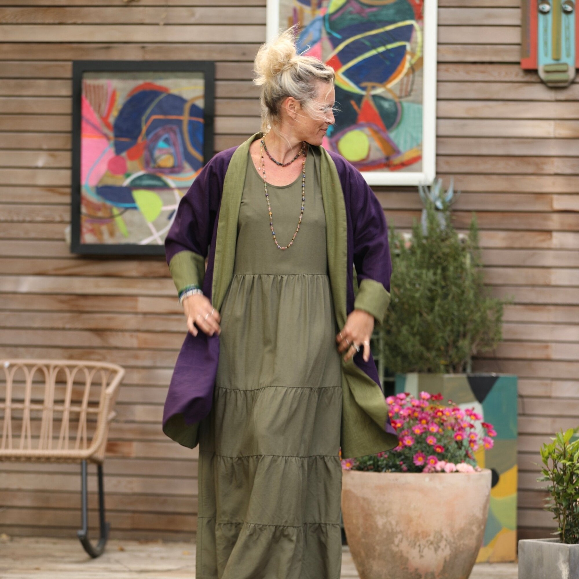 Lisandre est une veste réversible d'inspiration japonaise, confectionnée en lin aux teintes douces. Sa coupe ample, évoquant celle d'une cape, offre une silhouette fluide et élégante.