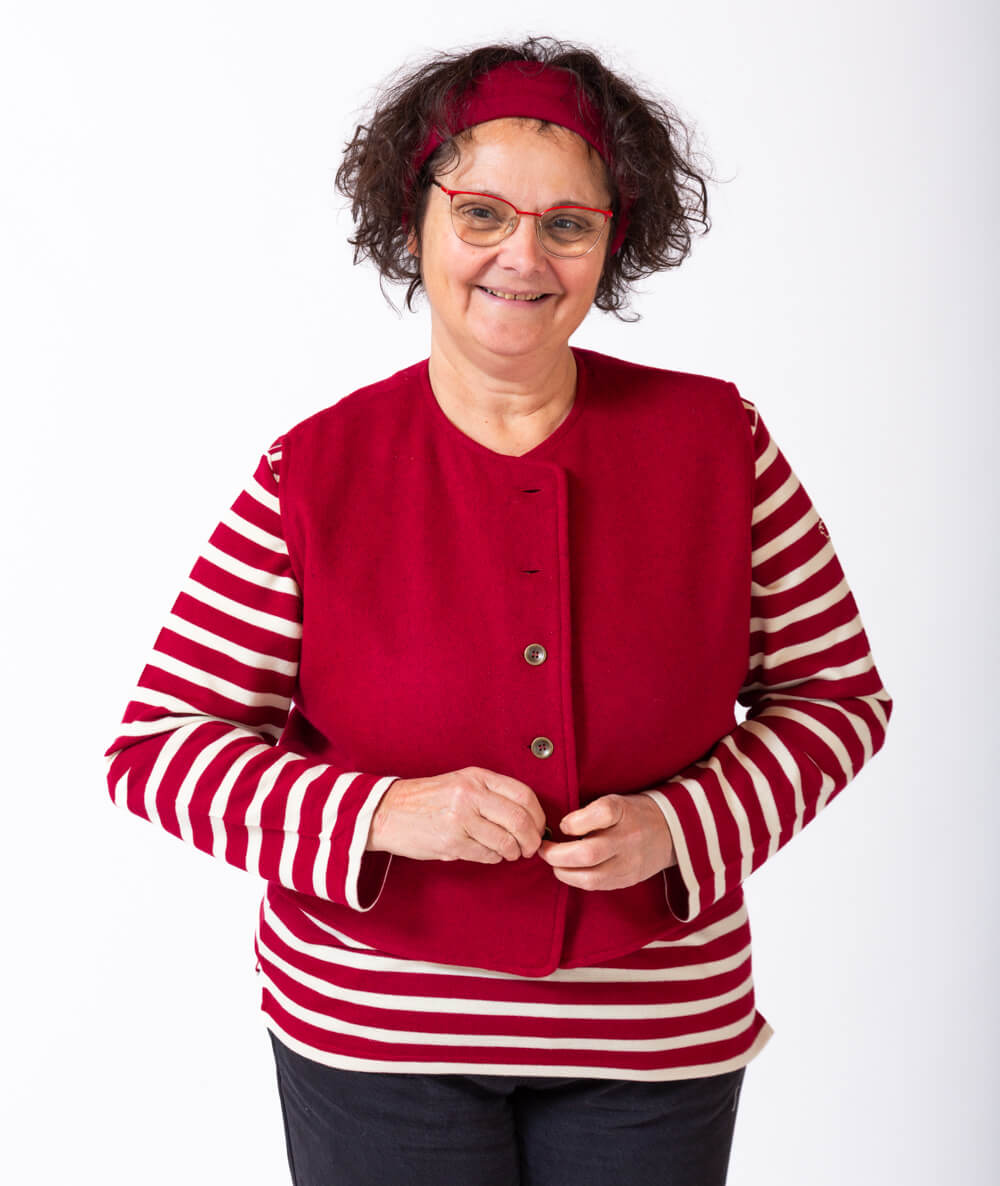 Ce veston en laine est disponible de la taille 0 à 5 (XS à XXL), en 3 coloris: Beige (sans teinture), Noir & Rouge.