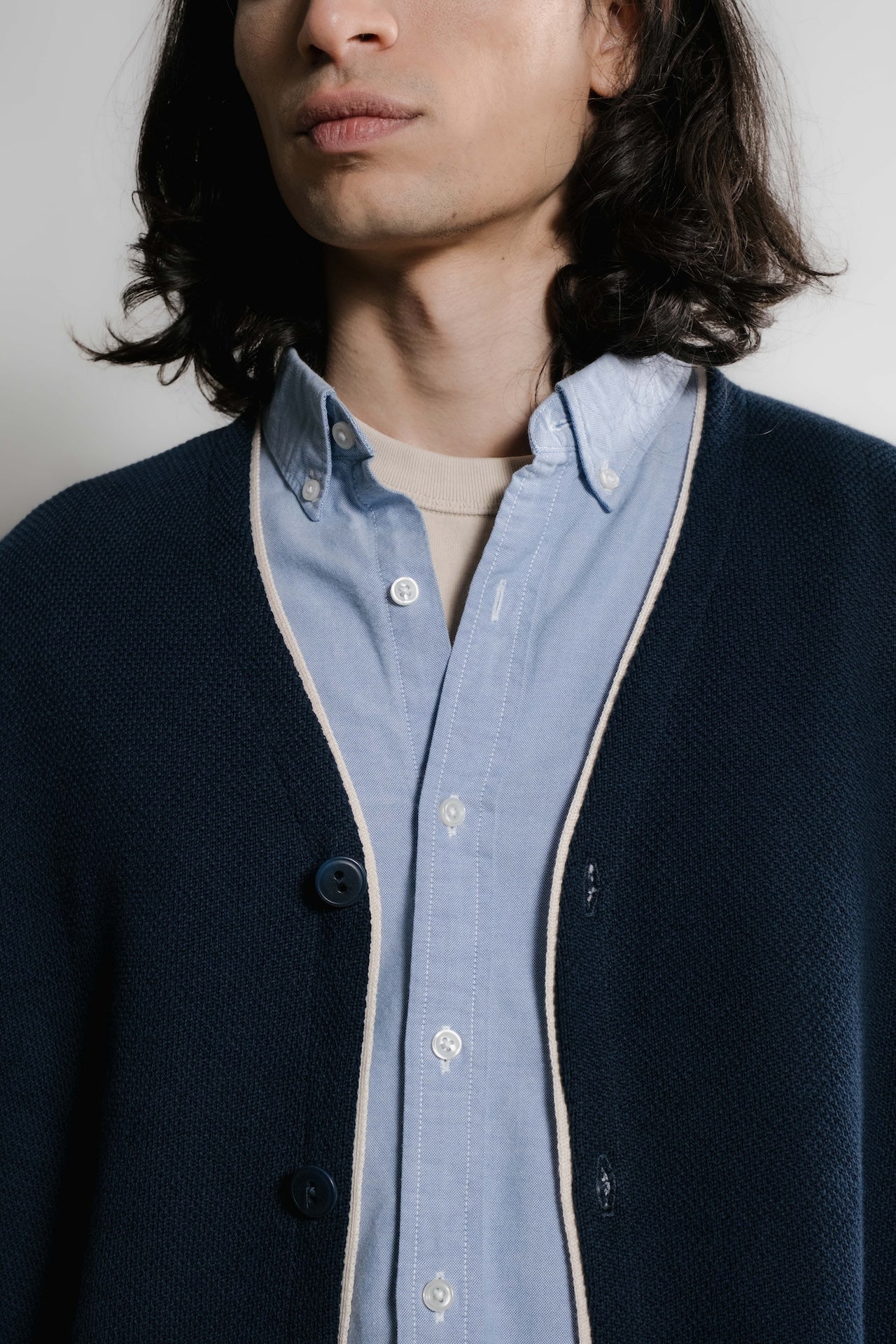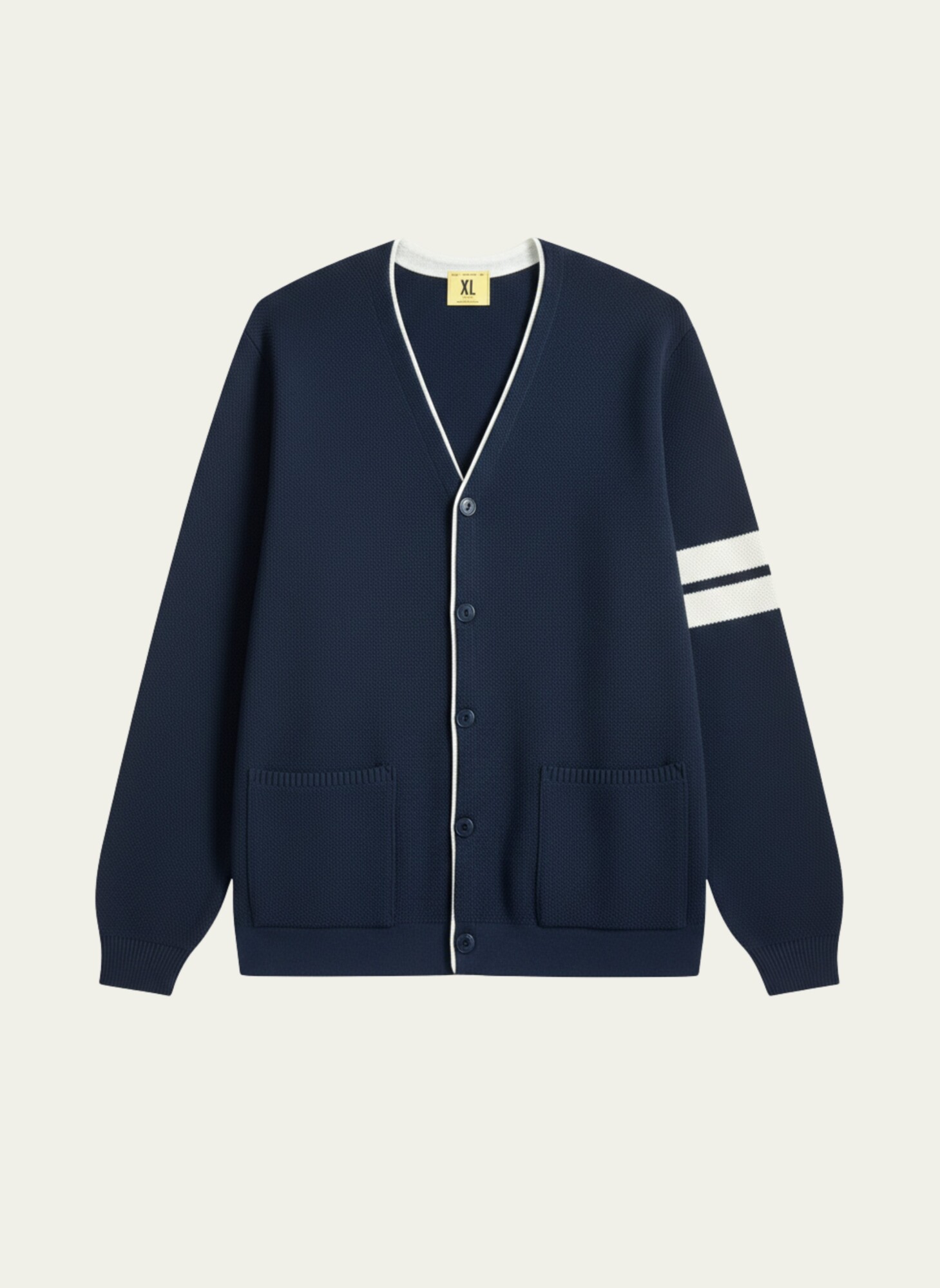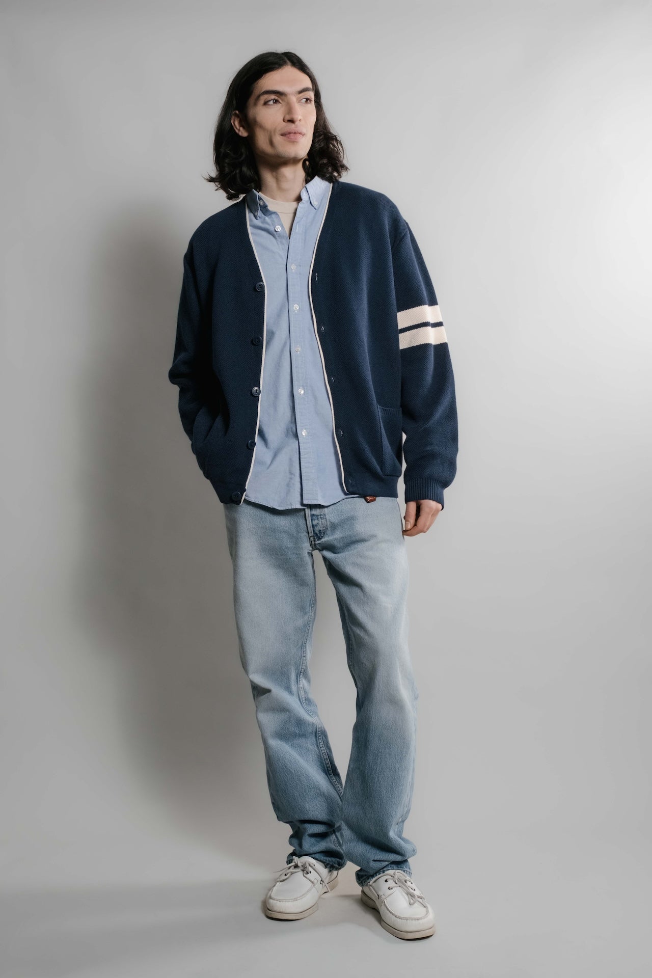 La maille du Youri, au-delà de son esthétisme, offre une tenue solide grâce à la structure de son tricot et à nos réglages précis. Nous avons créé ce cardigan pour obtenir une pièce structurée, qui conserve son caractère même portée sur un t-shirt, une chemise, ou un sweat à capuche. Pour le style, nous nous sommes inspirés des cardigans américains des universités des années 60, en reprenant le bord-côtes tubulaire et les bandes sur les épaules. Pour les plus attentifs, il s’agit du même modèle que nous avions réalisé en collaboration avec la boutique MERCI cet hiver (voir page Collab), mais cette fois-ci en coton. Le cardigan Youri Collège reprend ces codes : ses deux bandes colorées sur les manches rappellent l’univers universitaire américain. Tricoté en maille piquée serrée, il offre un toucher doux et une tenue droite et structurée. Il est doté de deux poches ton sur ton, tricotées dans la même maille et cousues directement sur la pièce pour plus de fluidité. Ses cinq boutons en corozo — un matériau naturel issu de la noix d’un palmier, également appelé « ivoire végétal » — sont fabriqués et teints en France, dans la baie de Somme. Matière : 100% coton peigné, labelissé OEKO-TEX standard 100 Tricotage en maille piquée, serrée, jauge 14 Finitions : bords-côtes tubulaire Toucher : doux et confortable 5 boutons en corozo Poids : 800 grammes en taille L